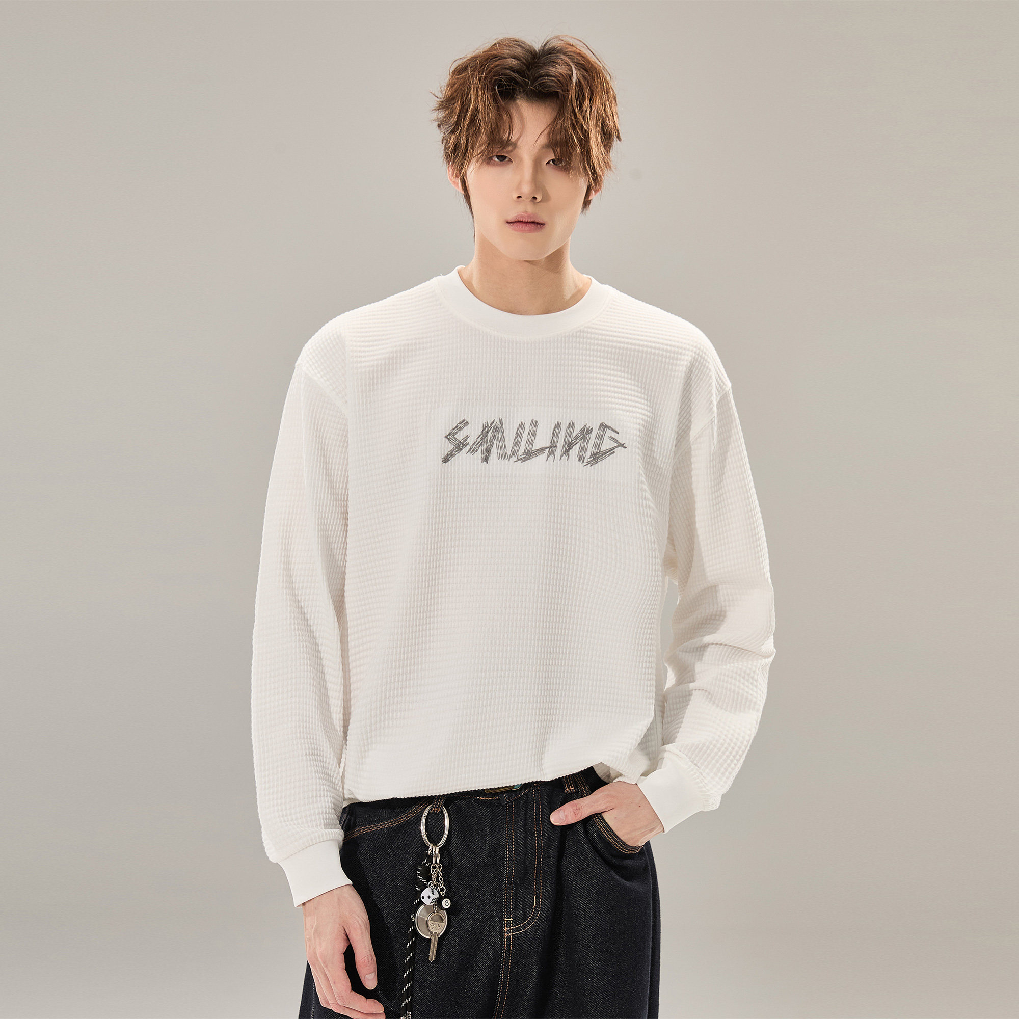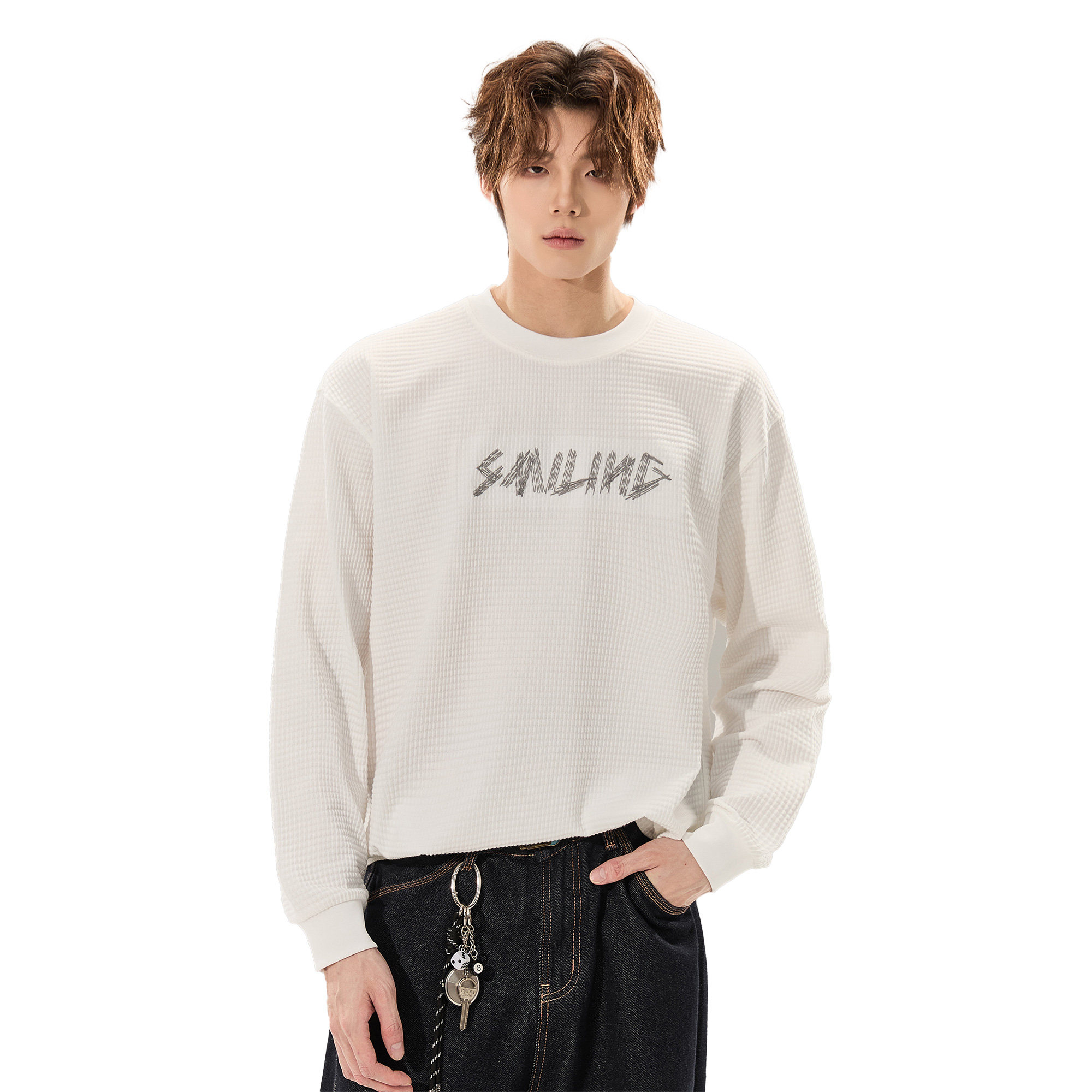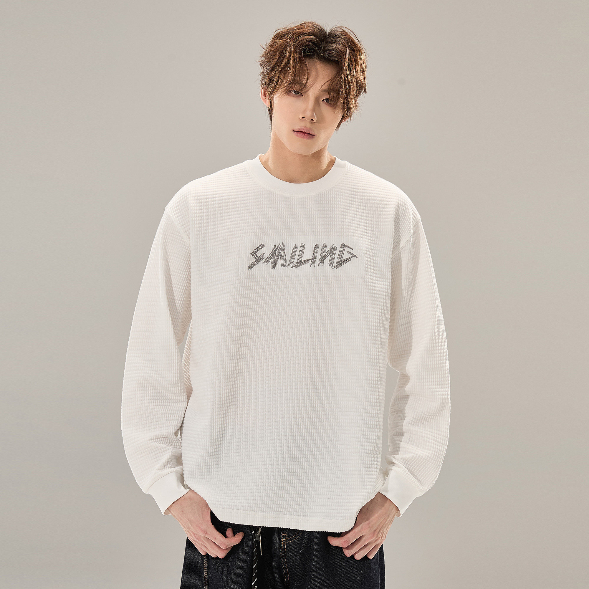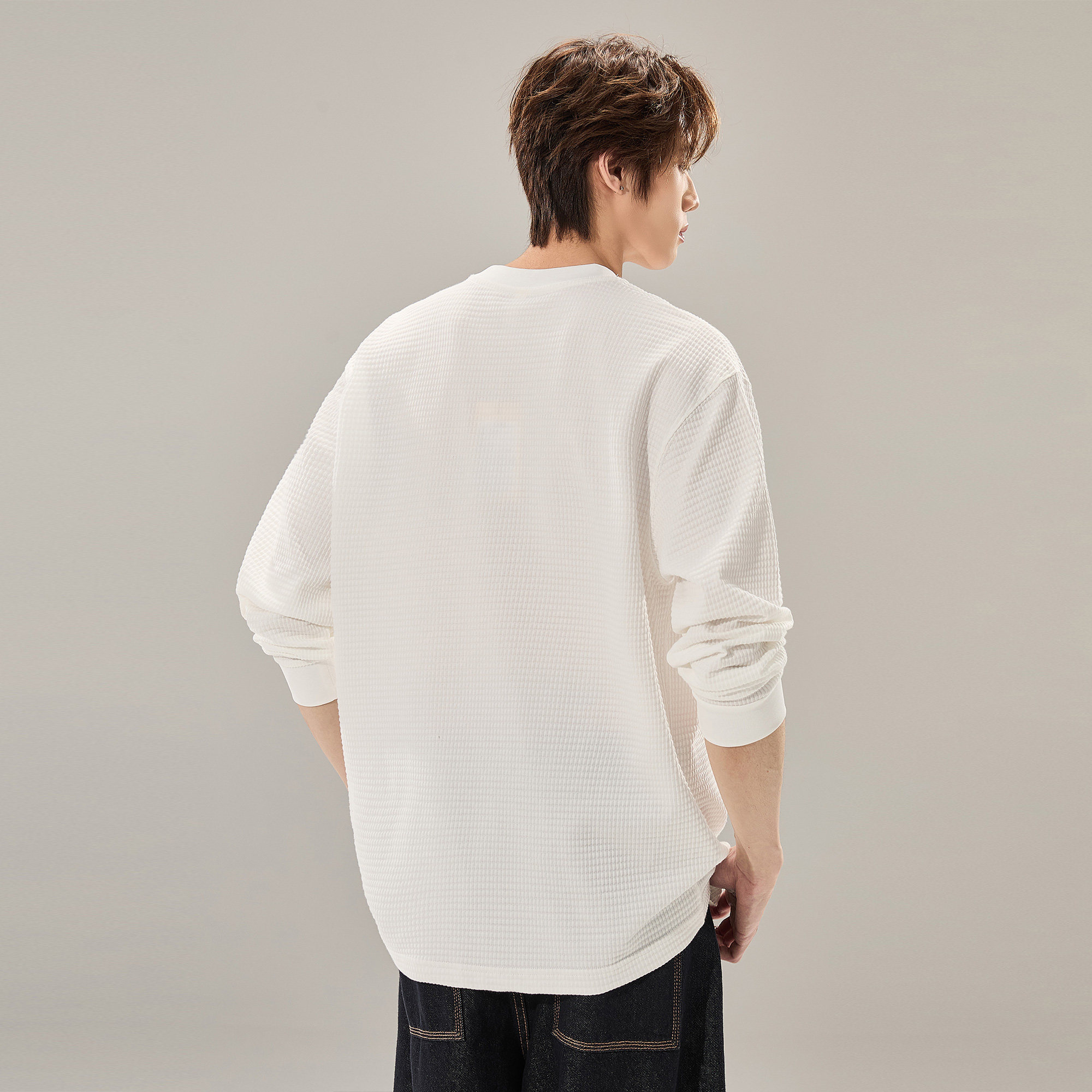 ALLIN 华夫格白色长袖T恤男春秋重磅220g打底衫情侣圆领套头上衣