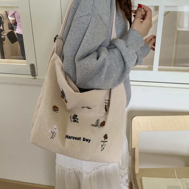 刺绣复古灯芯绒包女新款布包单肩大容量托特包上课通勤斜挎包手提