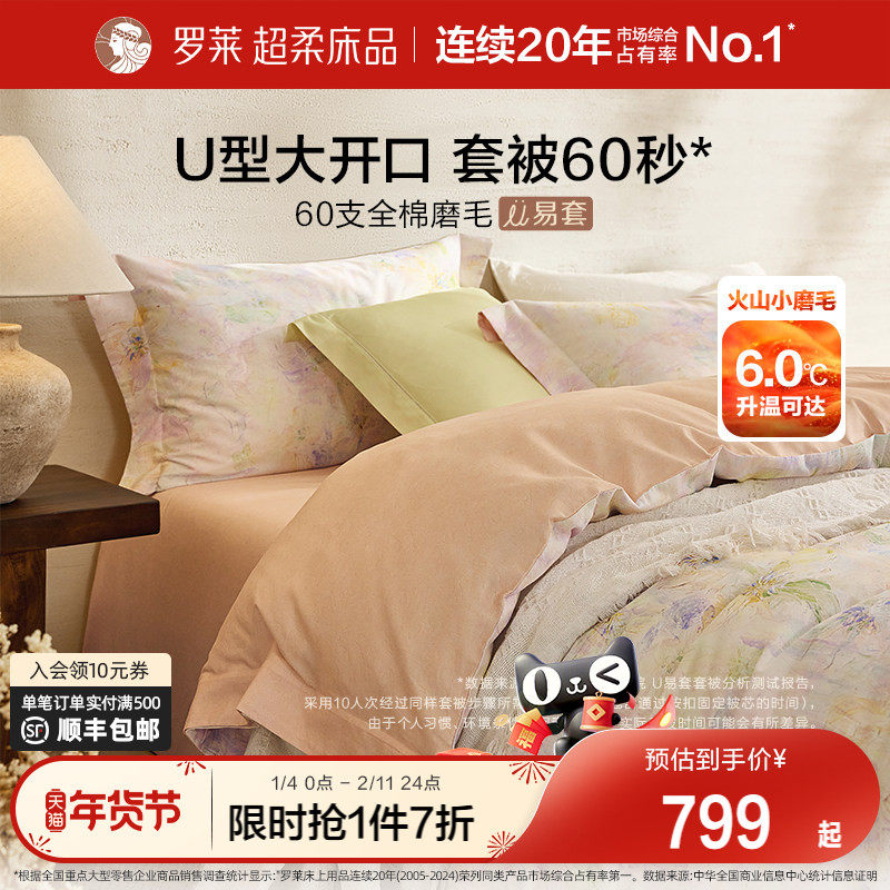 罗莱家纺U易套秋冬新品60支全棉磨毛四件套纯棉加厚保暖套件被套