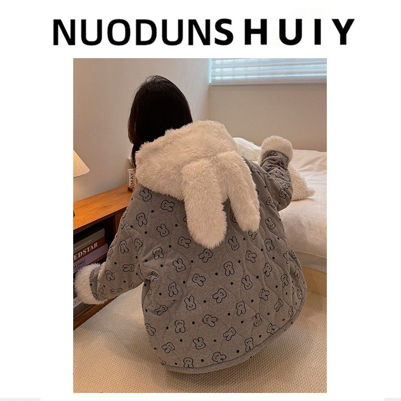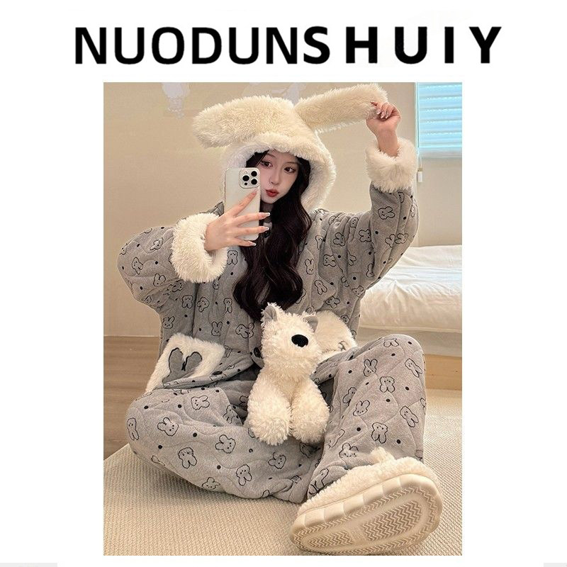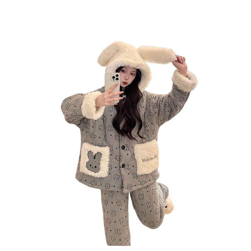 2025新款珊瑚绒睡衣女秋冬季三层夹棉加厚加绒保暖连帽家居服套装