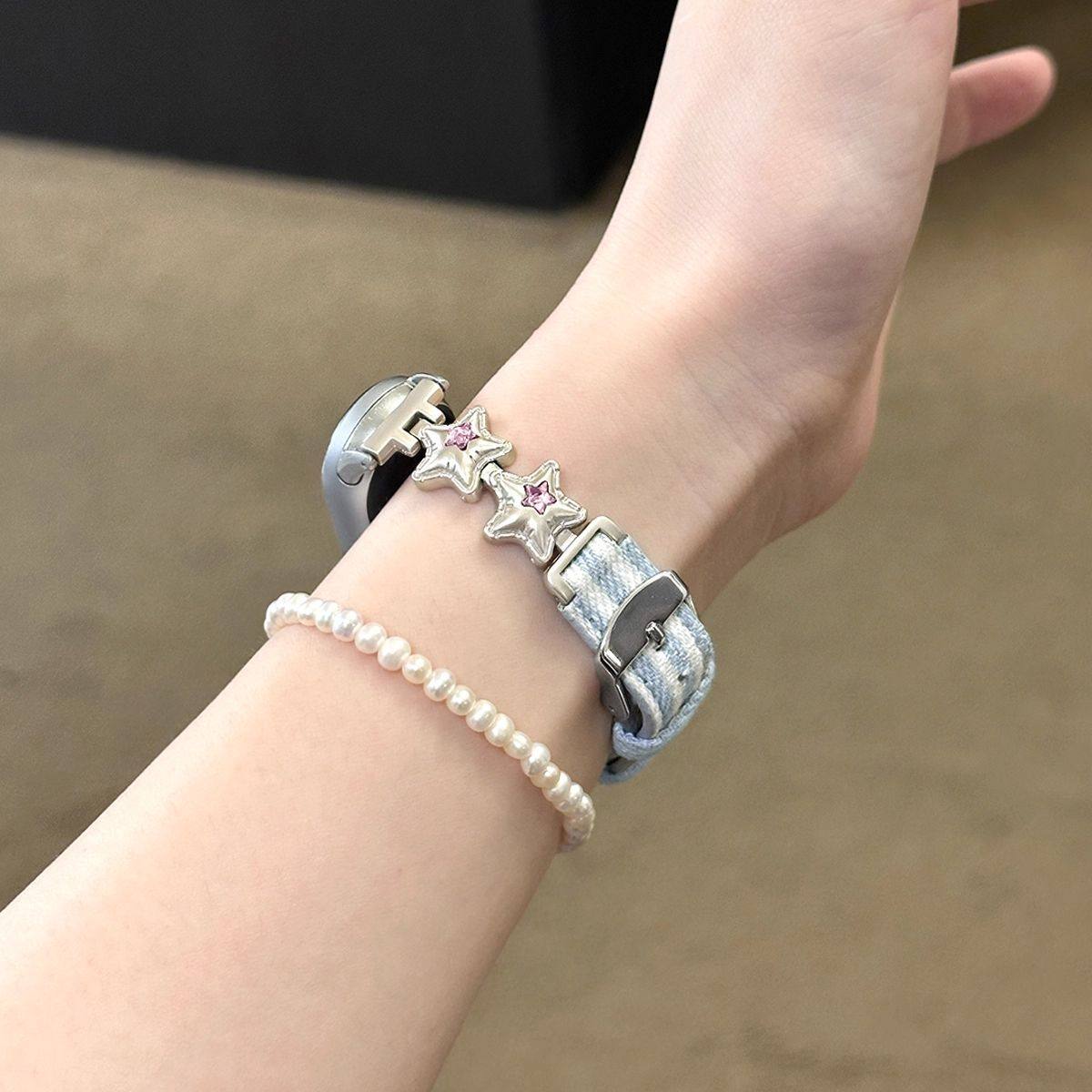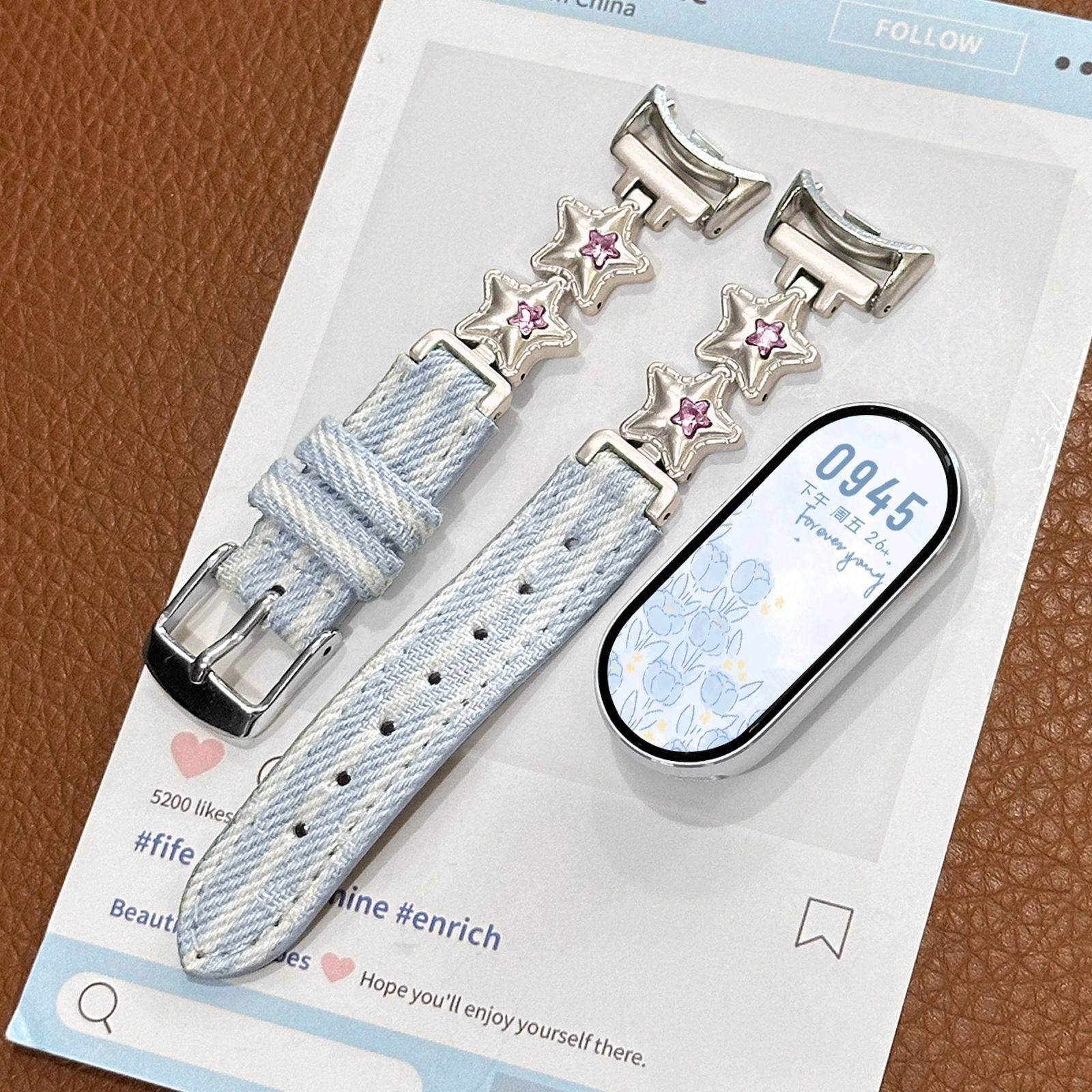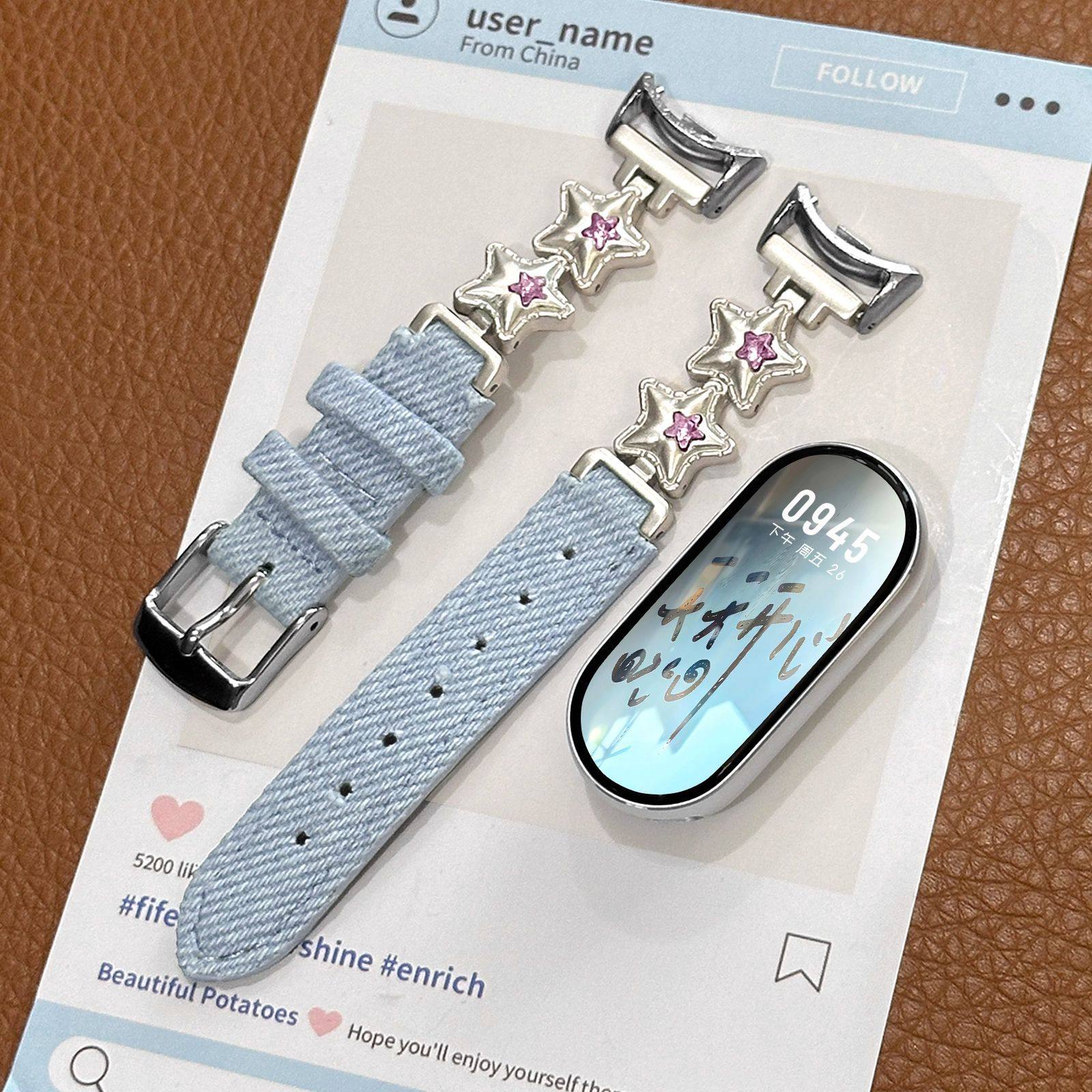 适用于小米手环10表带9/8爆款镶钻星星气球平纹拼金属表带7NFC版腕带彩钻星星平纹牛仔皮质表带女夏