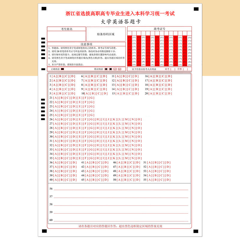 浙江省2026年选拔高职高专毕业生进入本科学习统一考试 大学英语答题卡 120克双胶纸 A4正反 考前练手答题纸
