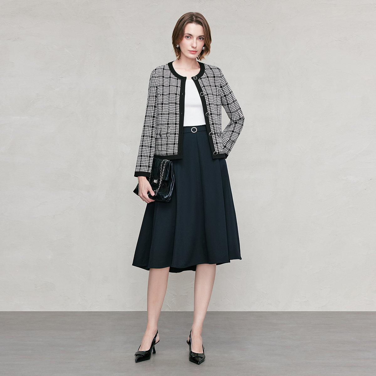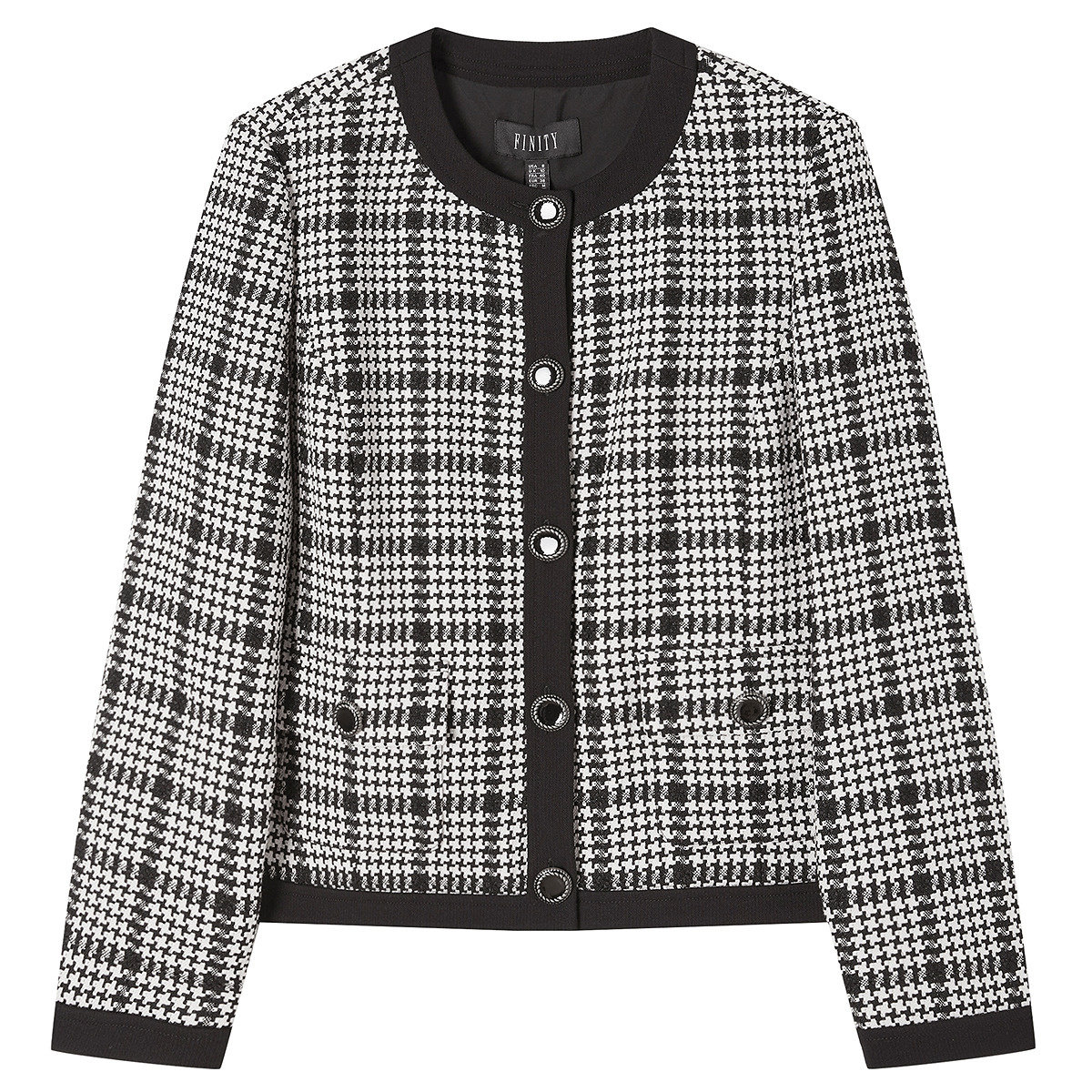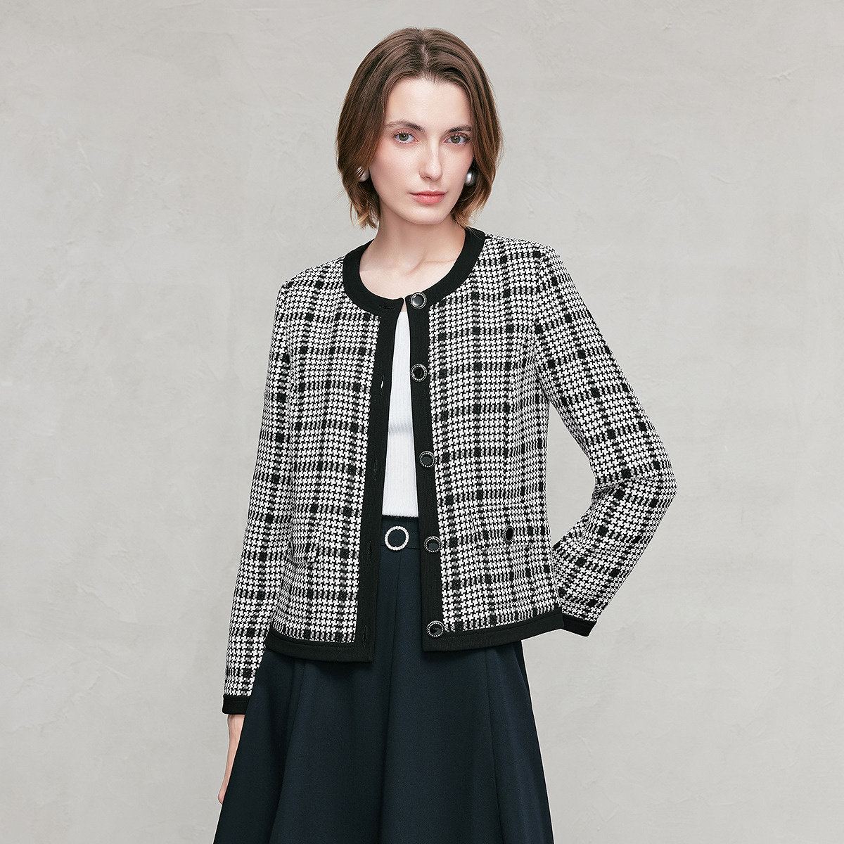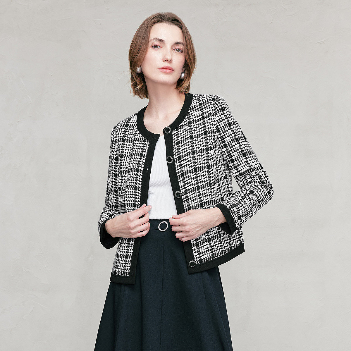 FINITY菲妮迪小香风短外套2026年春季新款简约黑白格纹无领上衣女