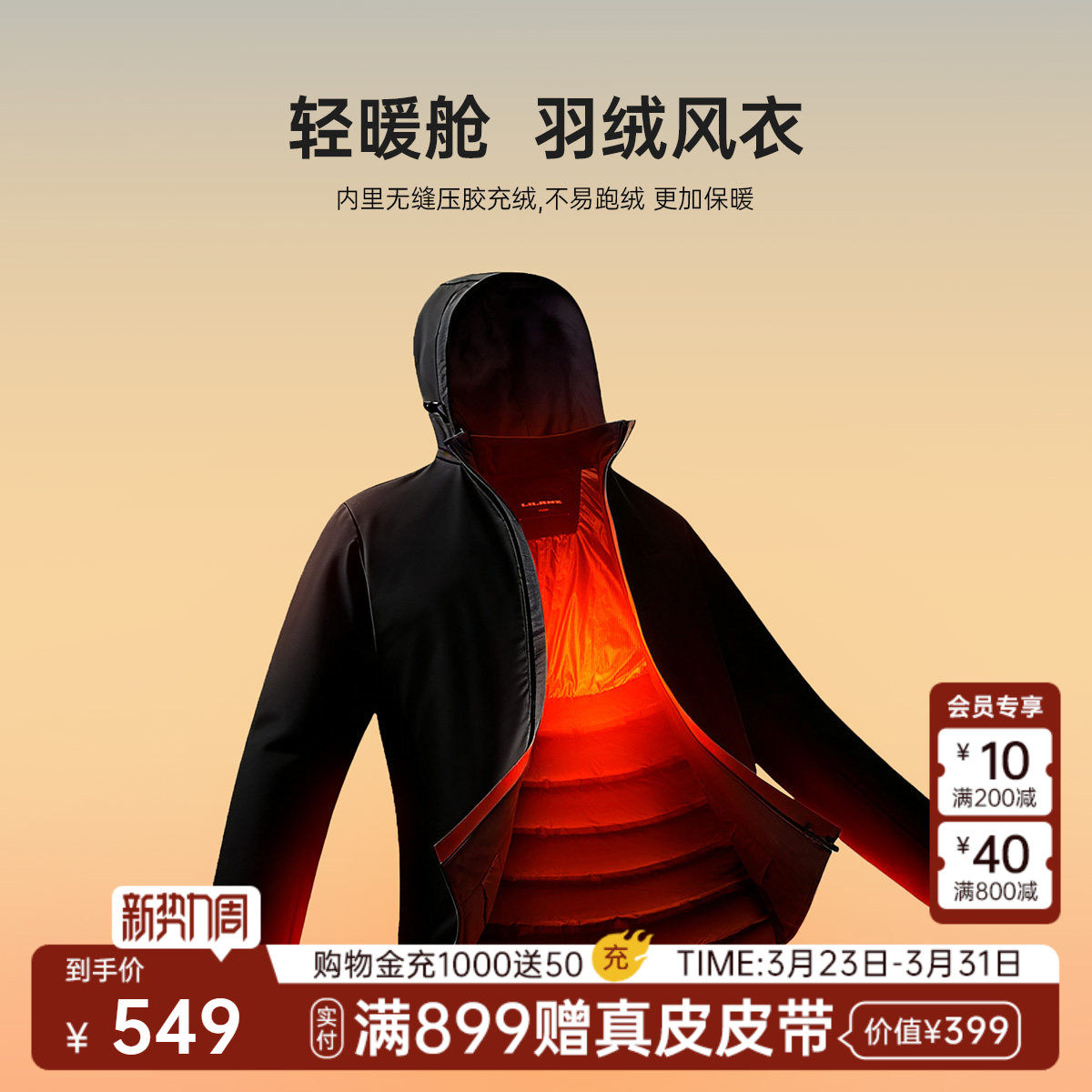 【多孔膜/拒水】利郎官方轻薄羽绒服男可拆连帽冬季夹克外套