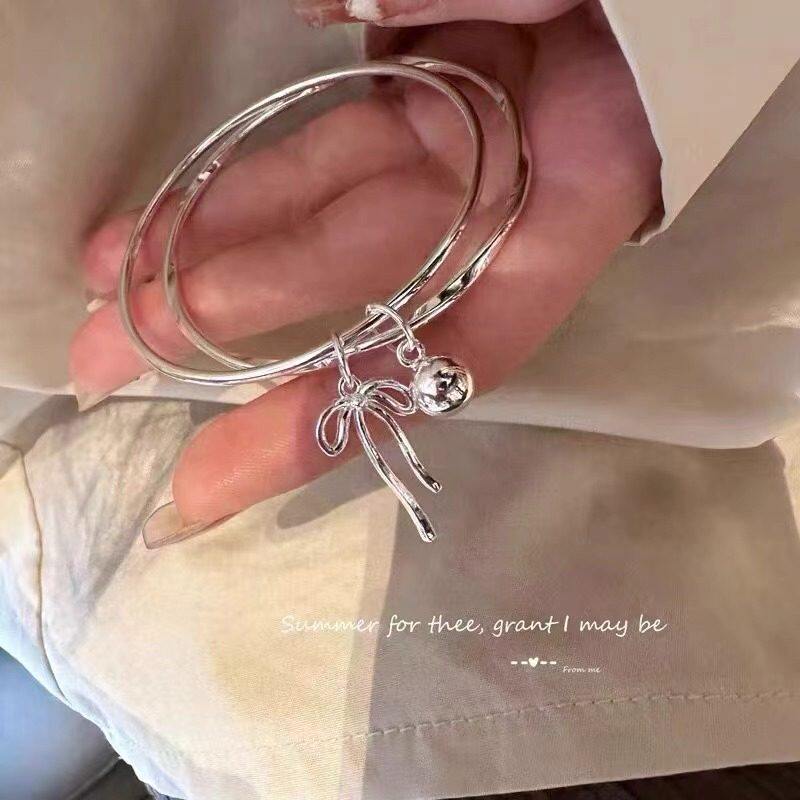 【幂琳】银手镯女纯银9999双环闭口蝴蝶结铃铛足银手镯简约百搭首