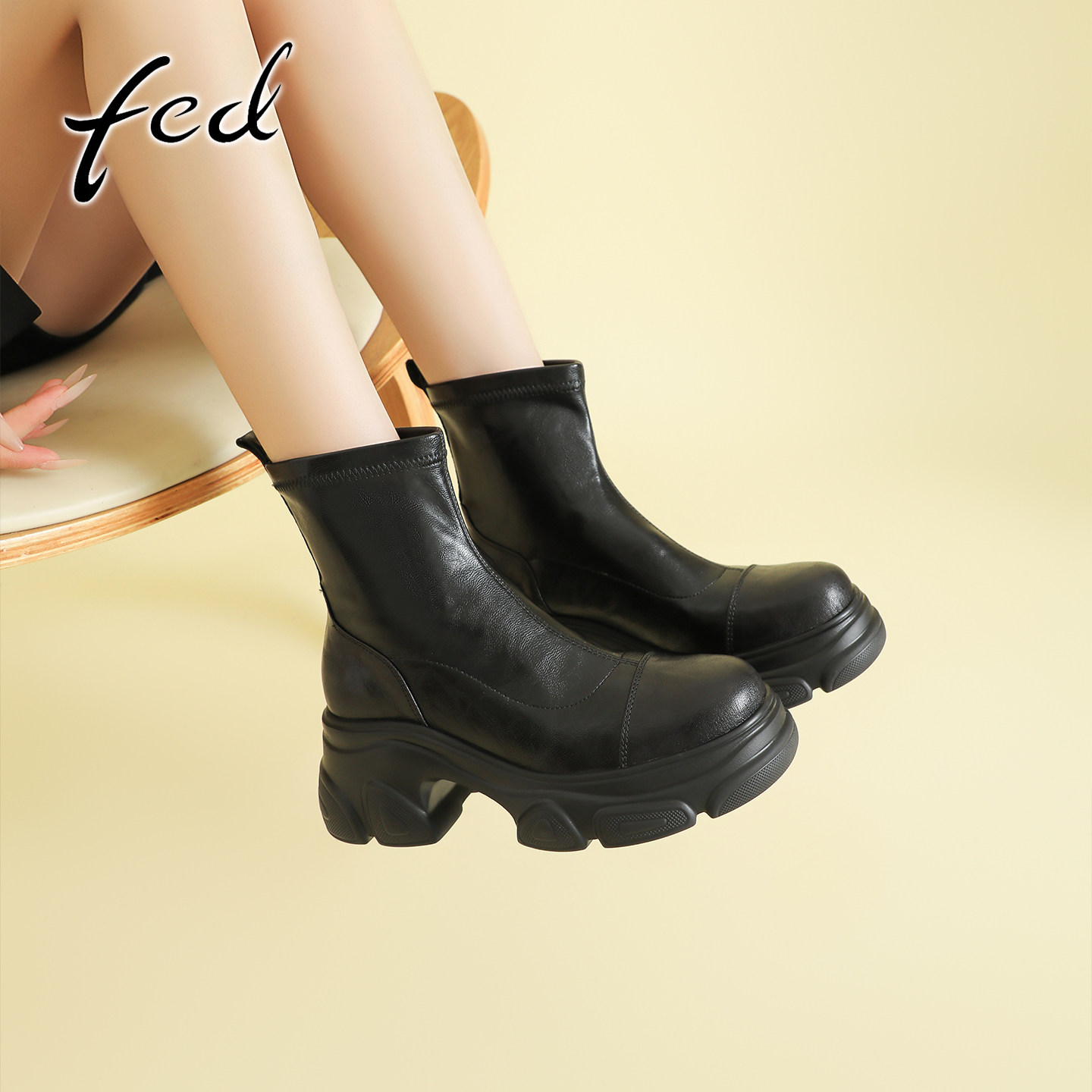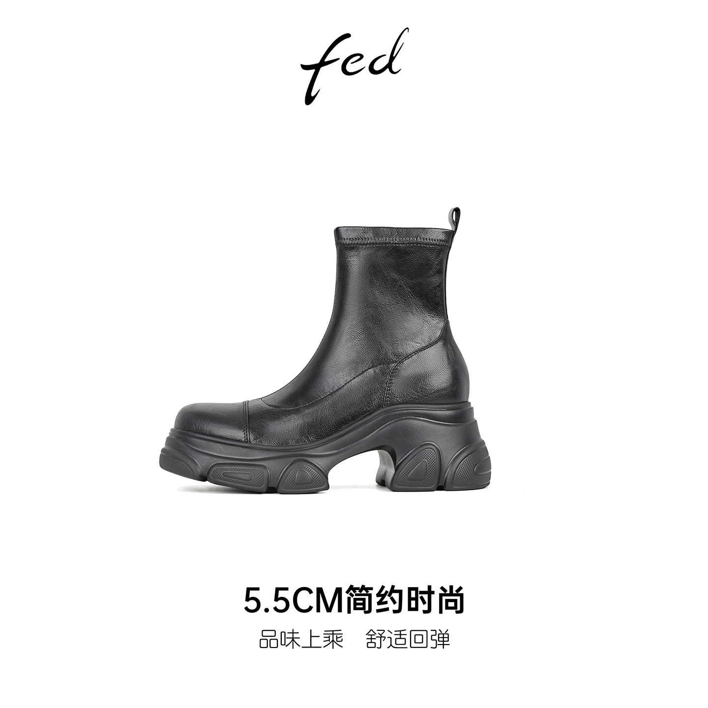 fed小个子真皮厚底增高弹力瘦瘦靴女秋冬新款百搭圆头高跟小短靴