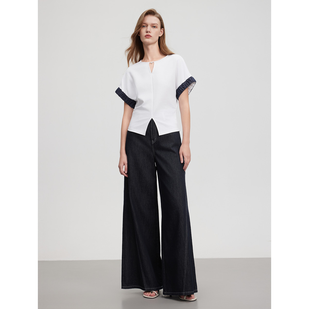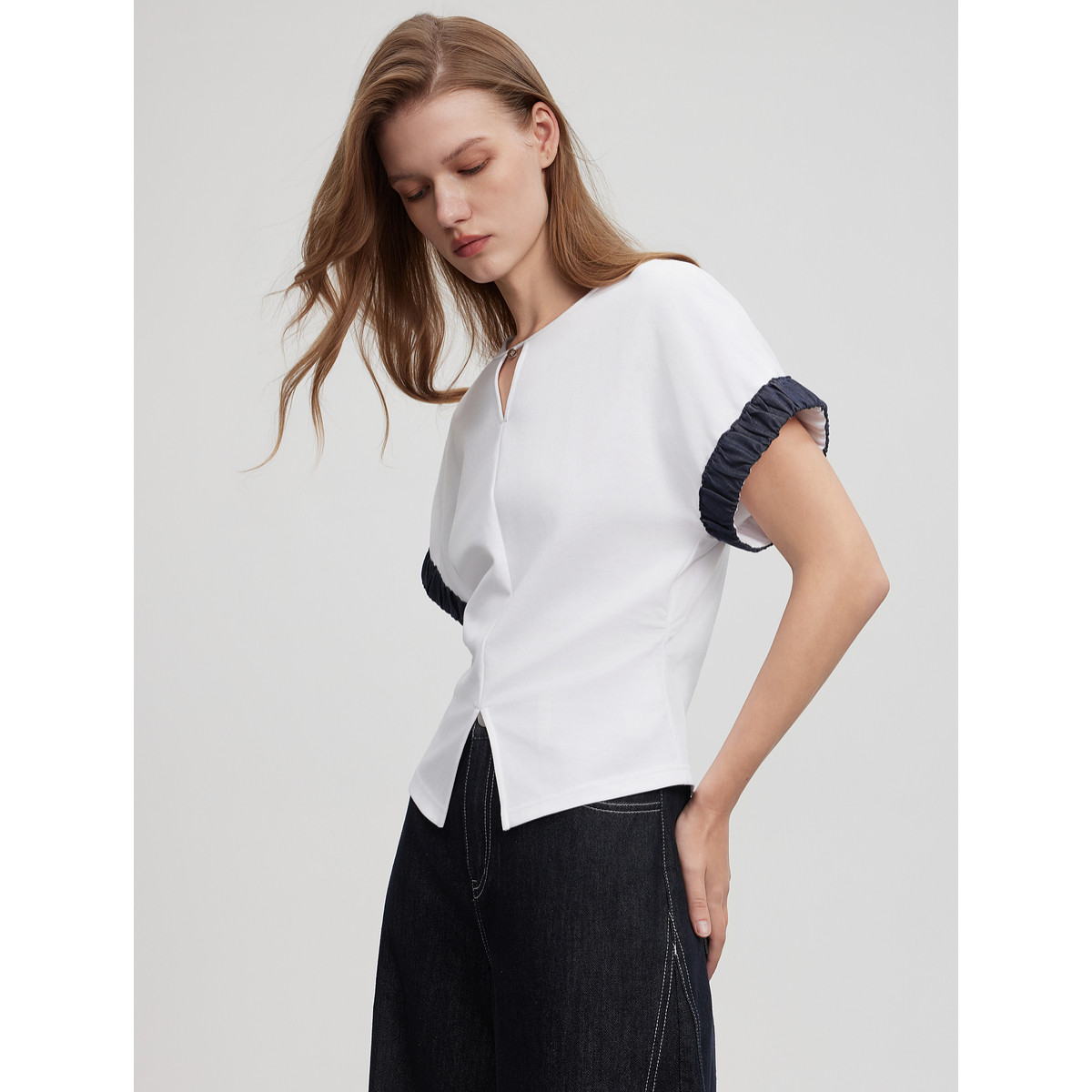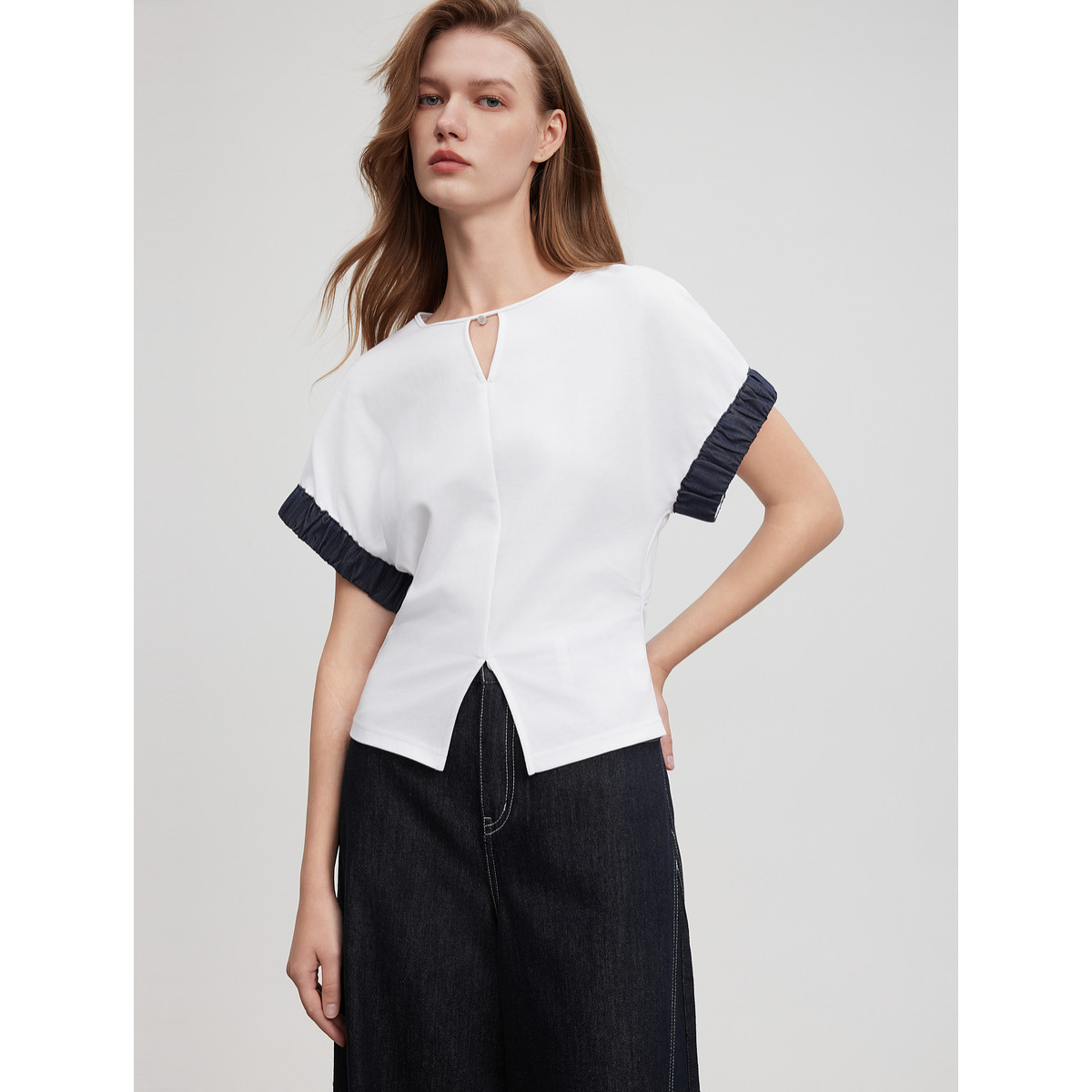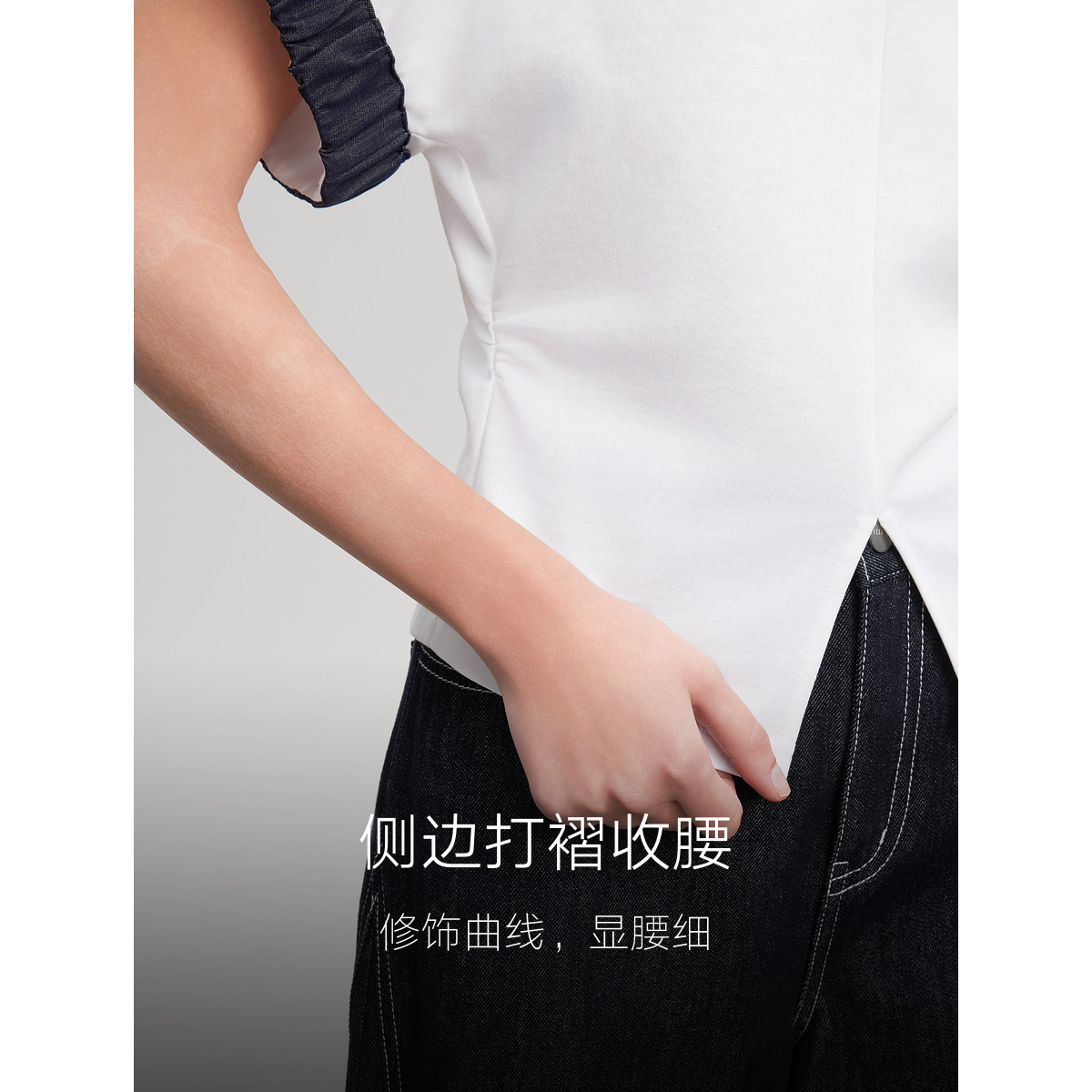 ELLE法式撞色拼接收腰短袖女2025夏季新款设计感打褶简约T恤上衣