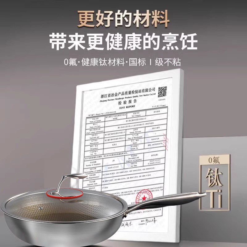德国三头鹰无涂层钛锅不粘锅电磁炉燃气纯钛炒锅多功能家用炒菜锅