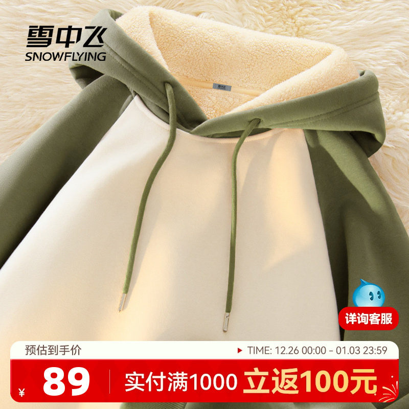 雪中飞撞色连帽卫衣女秋冬2025新款加绒羊羔绒外套女生冬装上衣PC