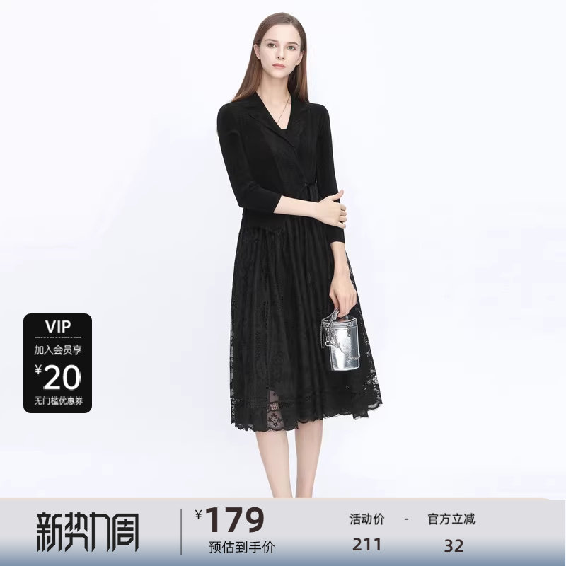 【秒杀】sdeer圣迪奥优雅西装领肌理蕾丝拼接系带连衣裙S21161201