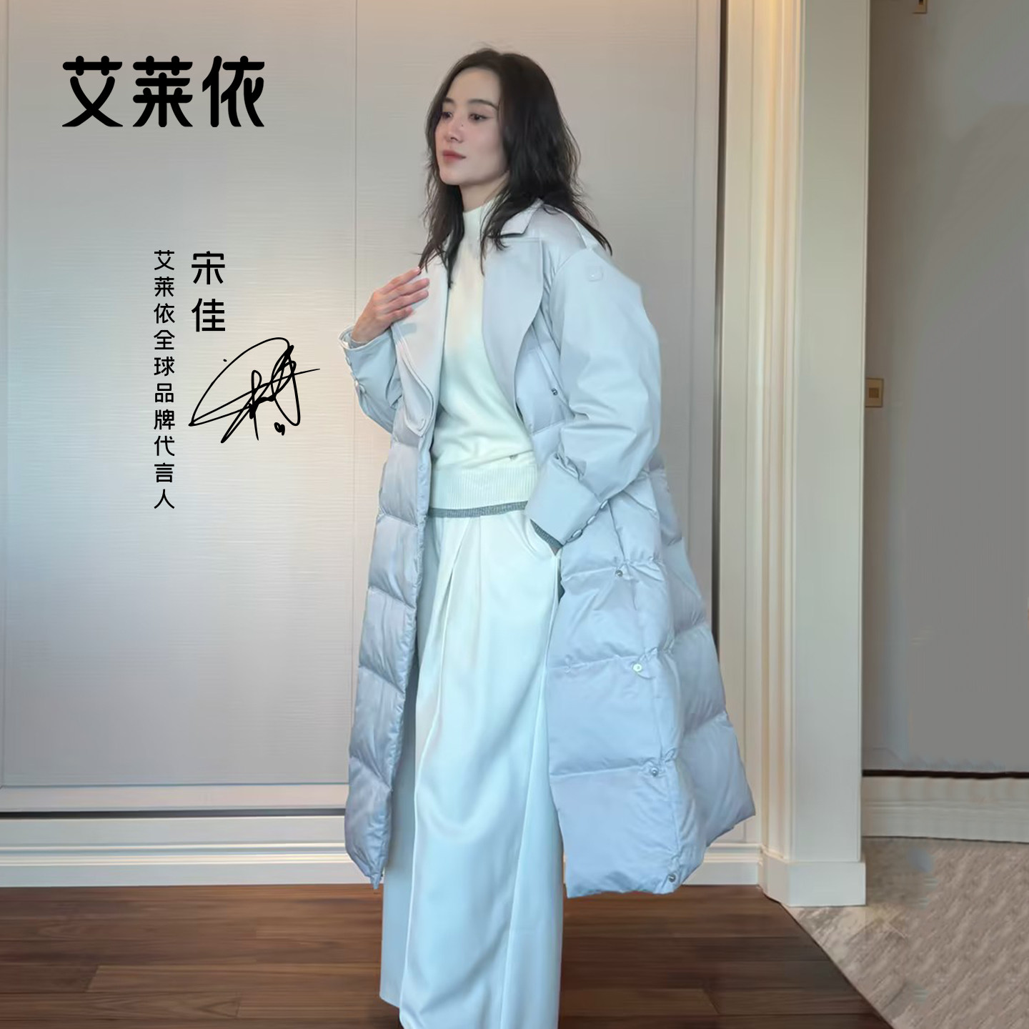 【宋佳同款】艾莱依2025新款鹅绒服风衣领时髦气质腰带长款羽绒服
