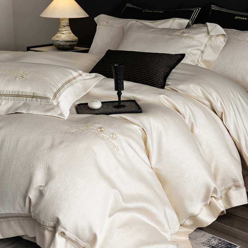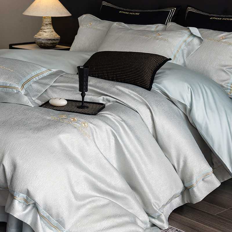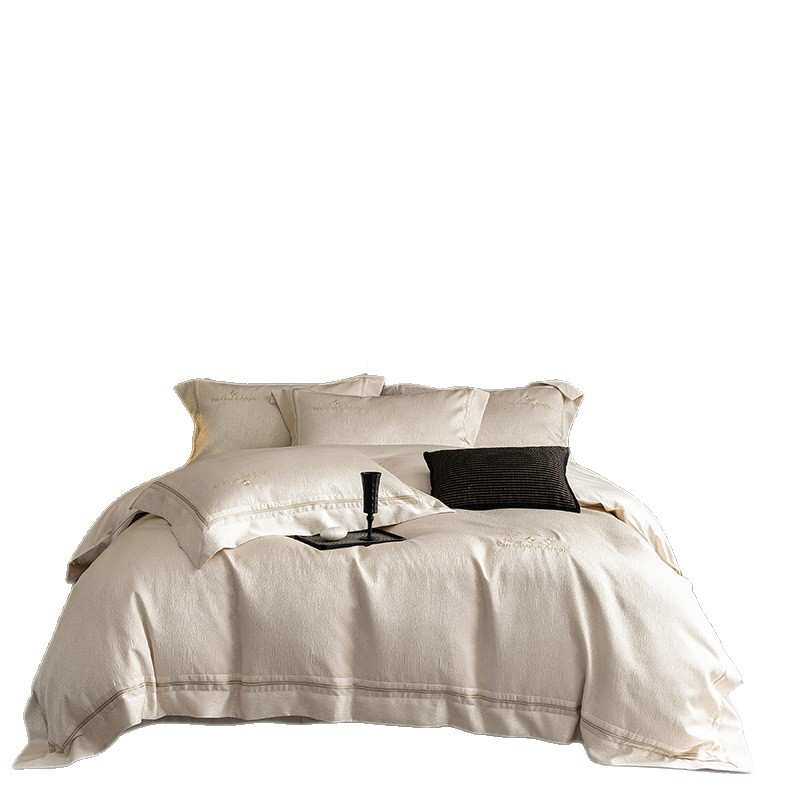 高奢鎏金超柔厚织天丝棉四件套别墅款轻奢套件纯色刺绣被套床单