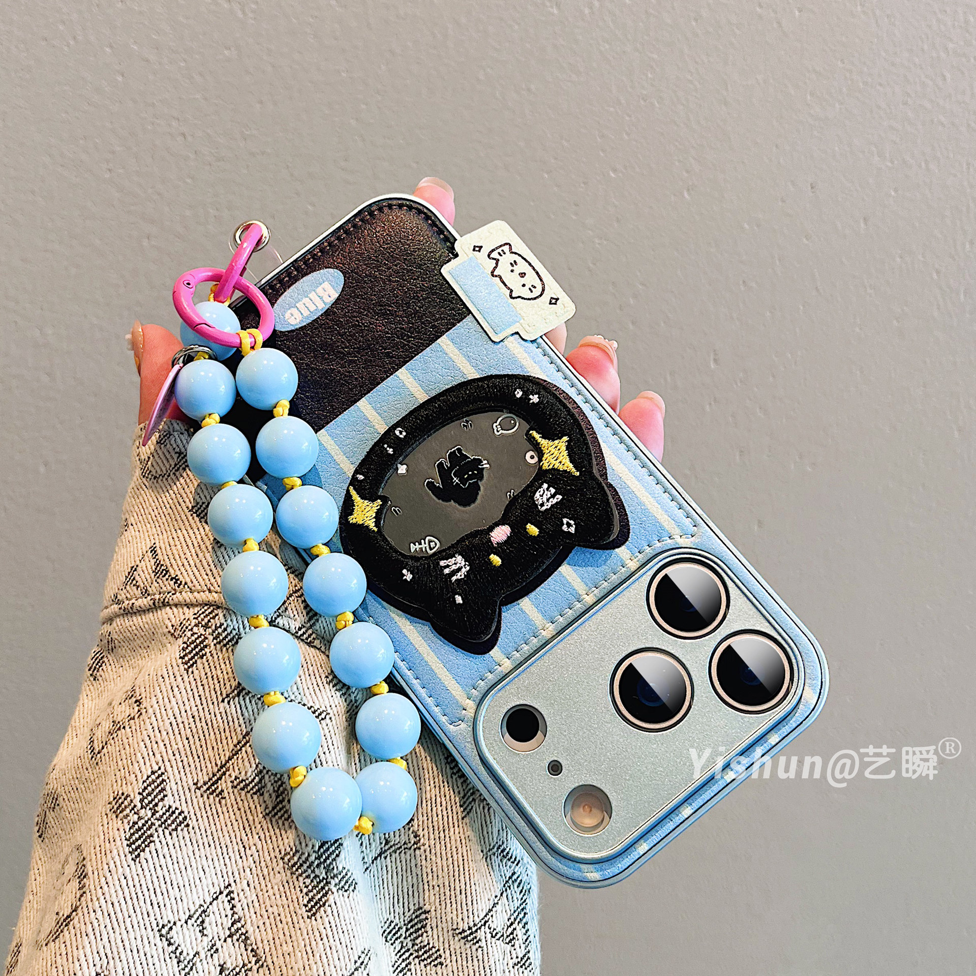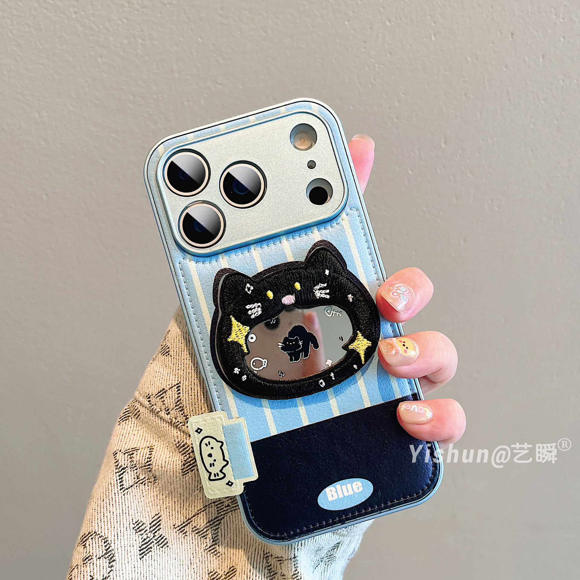 新款韩系条纹呆萌趣味镜面猫咪适用iPhone17ProMax手机壳苹果16pro卡通14创意13pm皮质鼓包15pro女款ip保护套