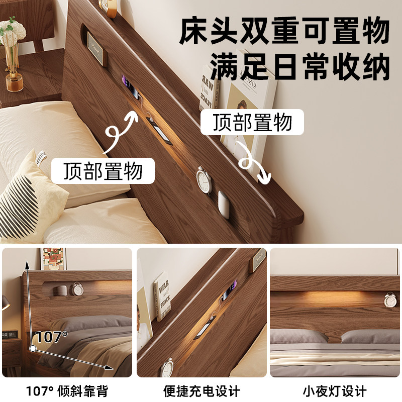 北欧实木床现代简约夜灯1.8米双人床1.5单人储物床小户型软靠婚床