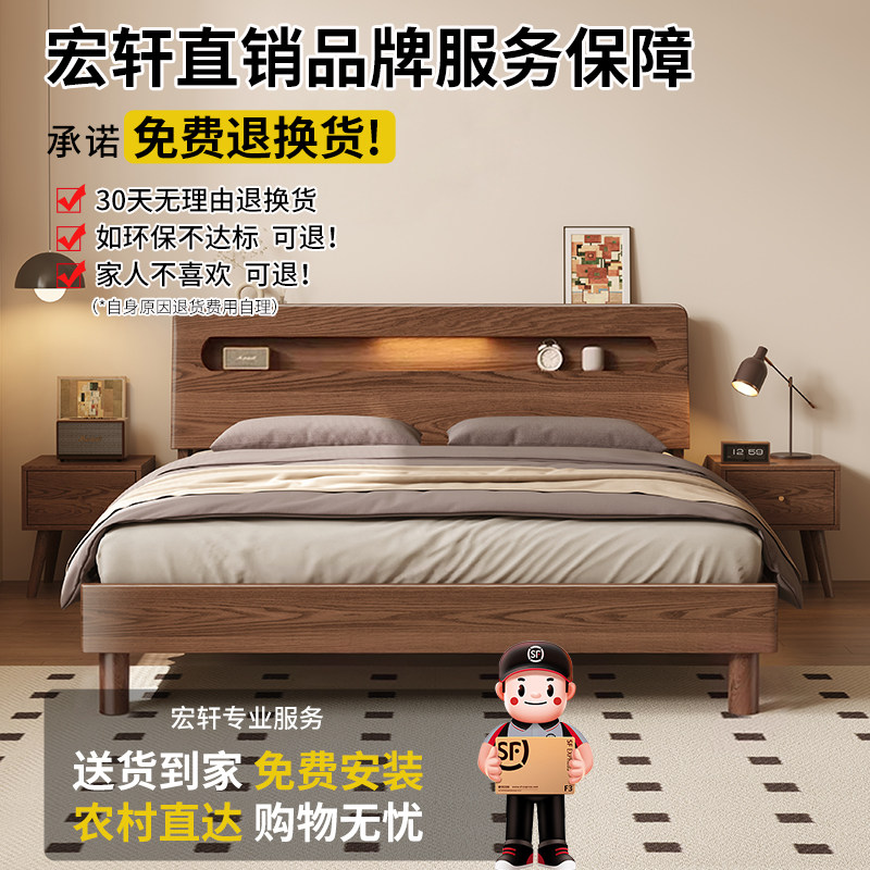 实木床现代简约胡桃木主卧1.5米双人床1.8米主卧轻奢婚房双人床