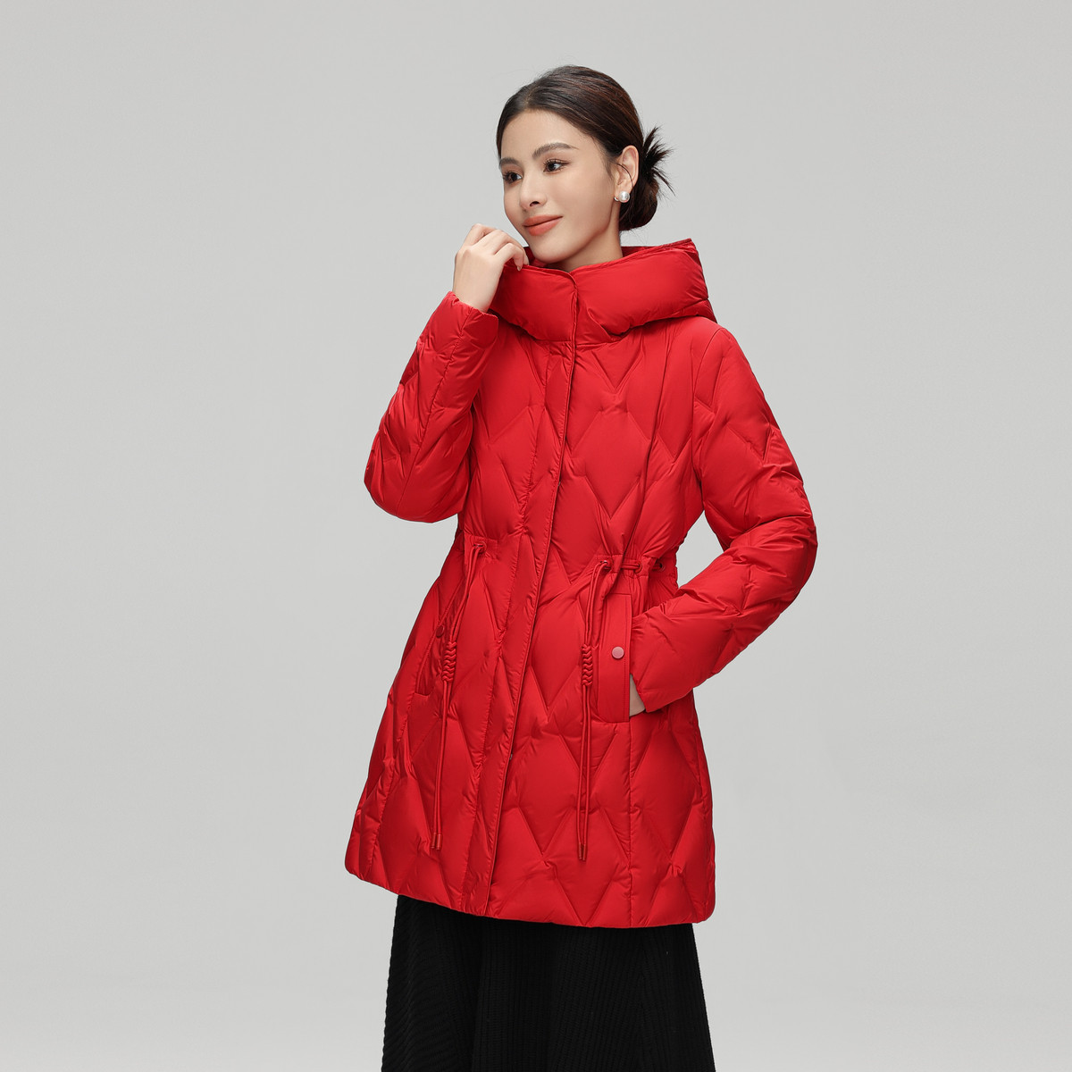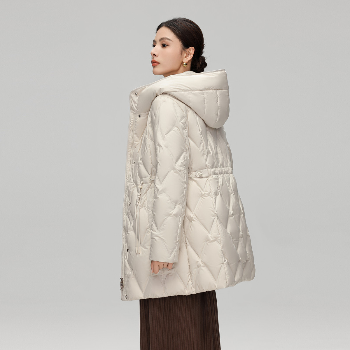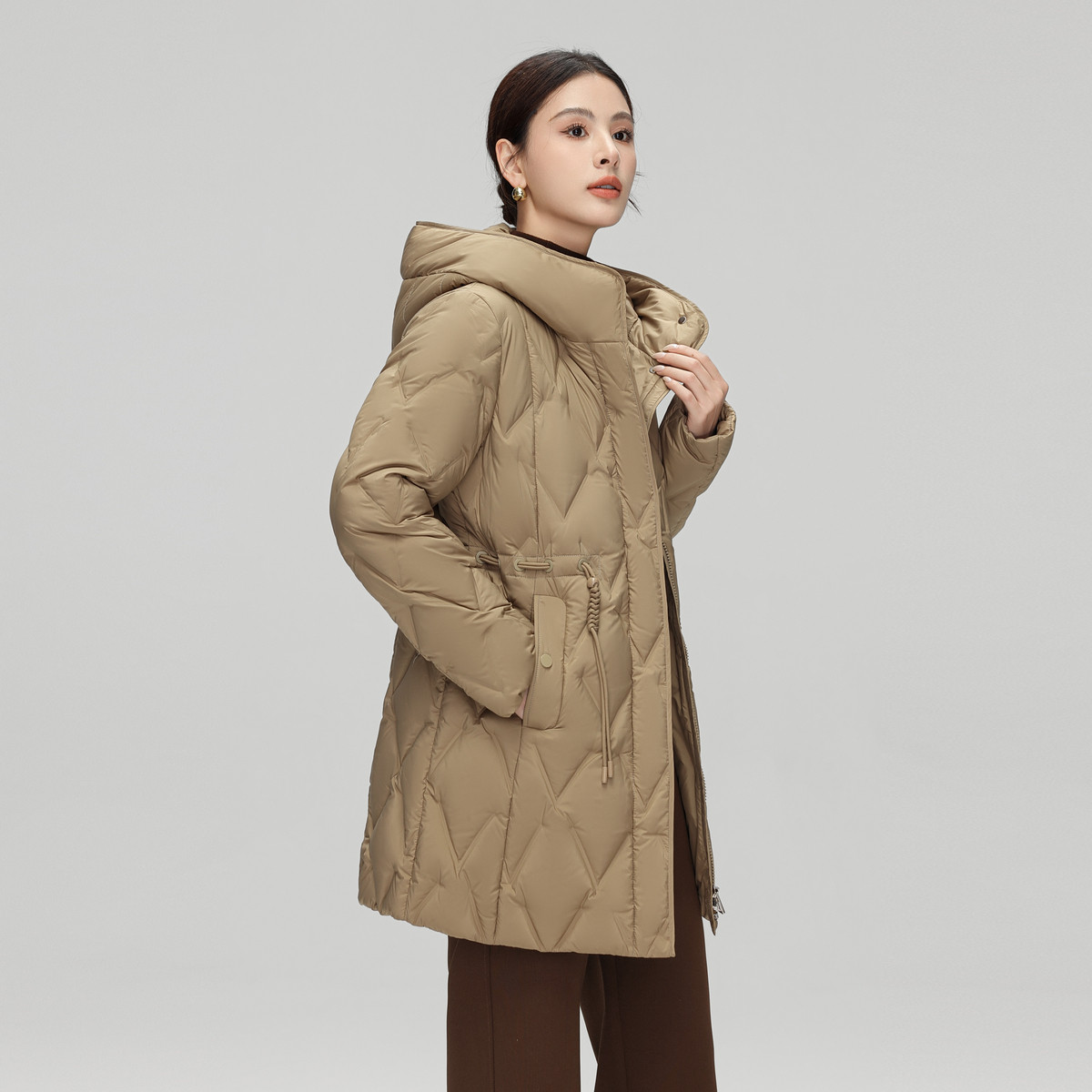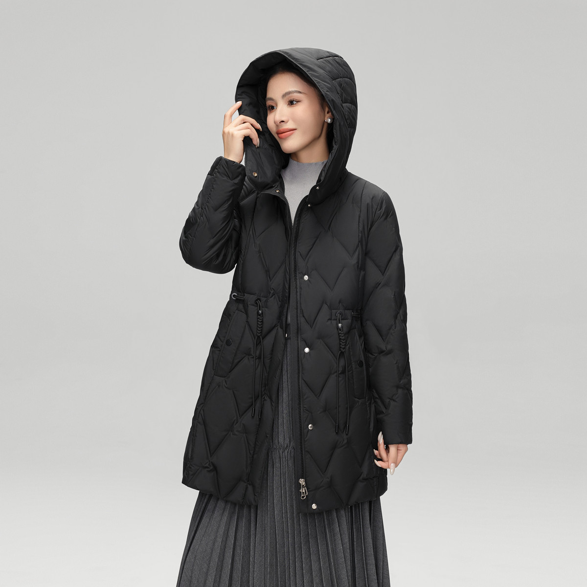 雪中飞2025冬新款女士中长款羽绒服连帽气质妈妈款编织收腰保暖