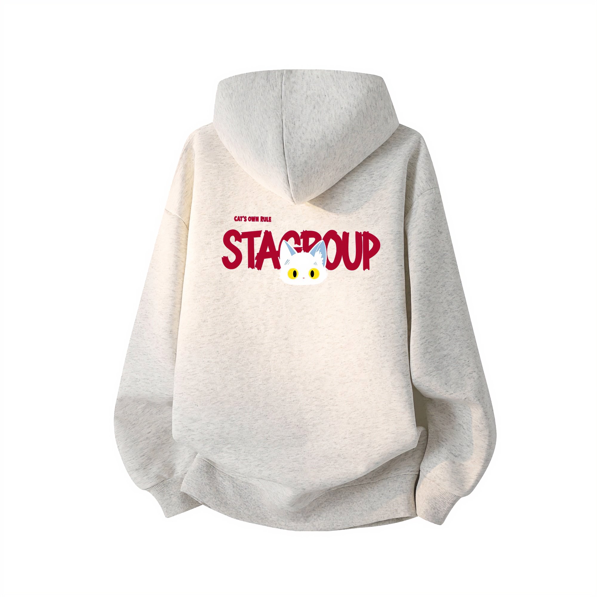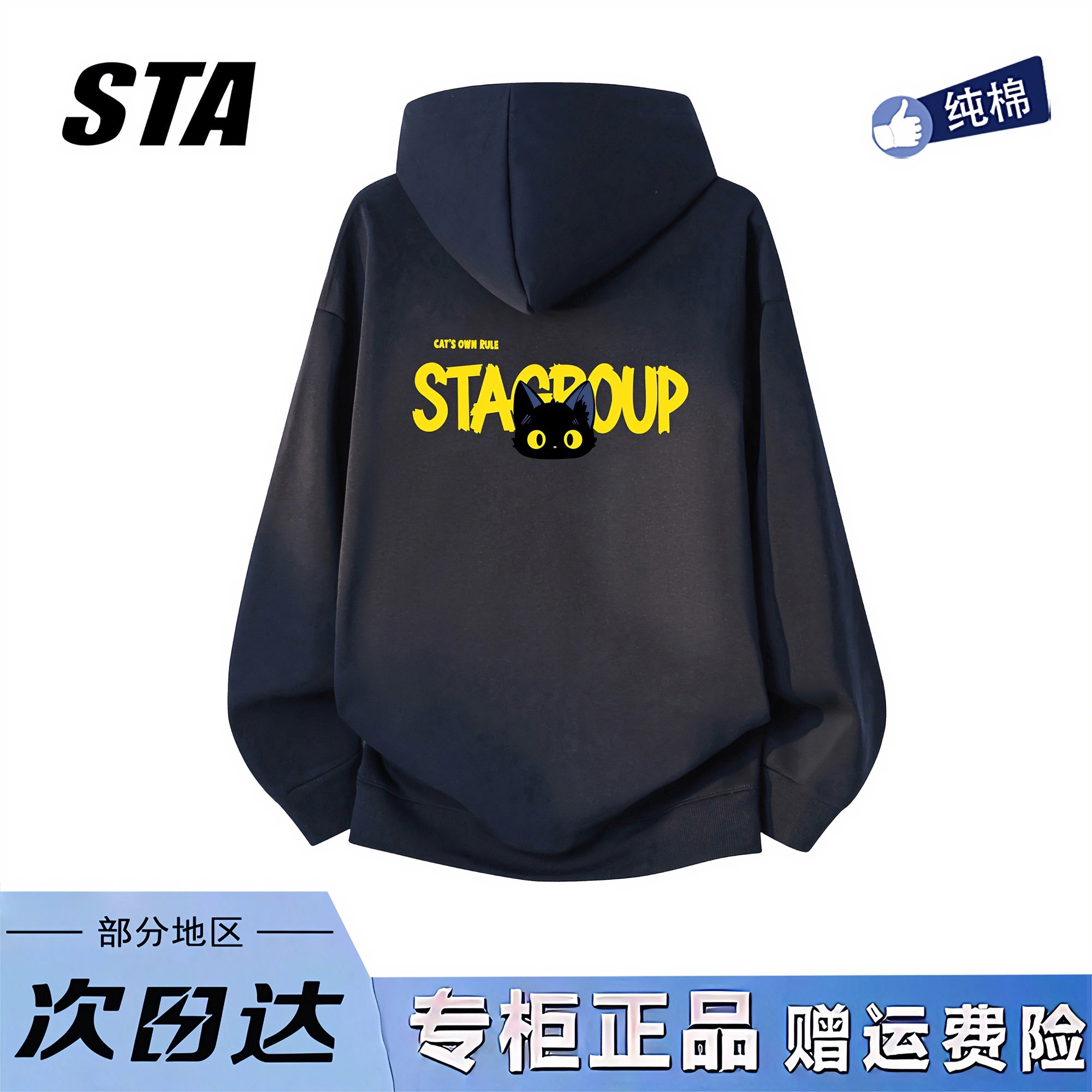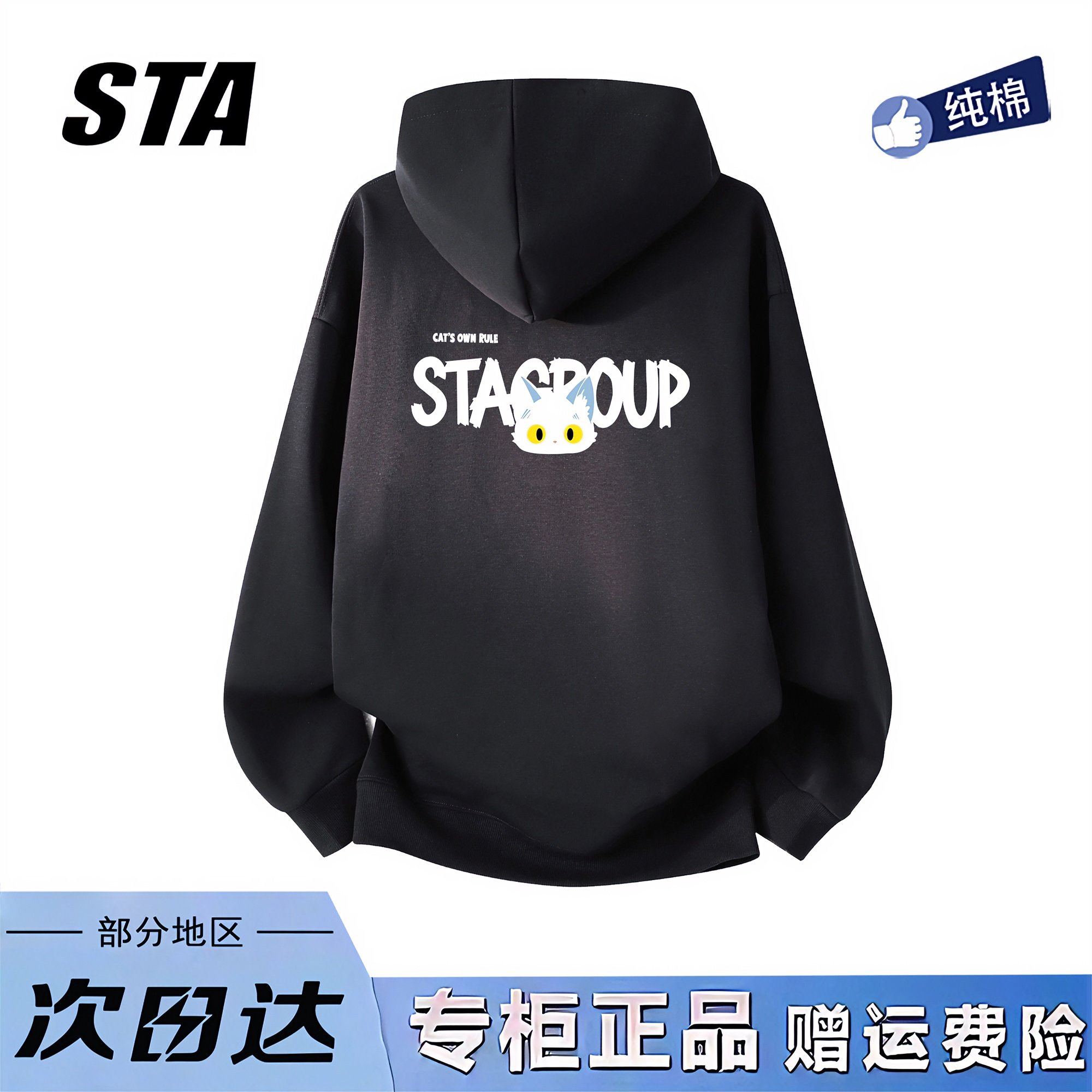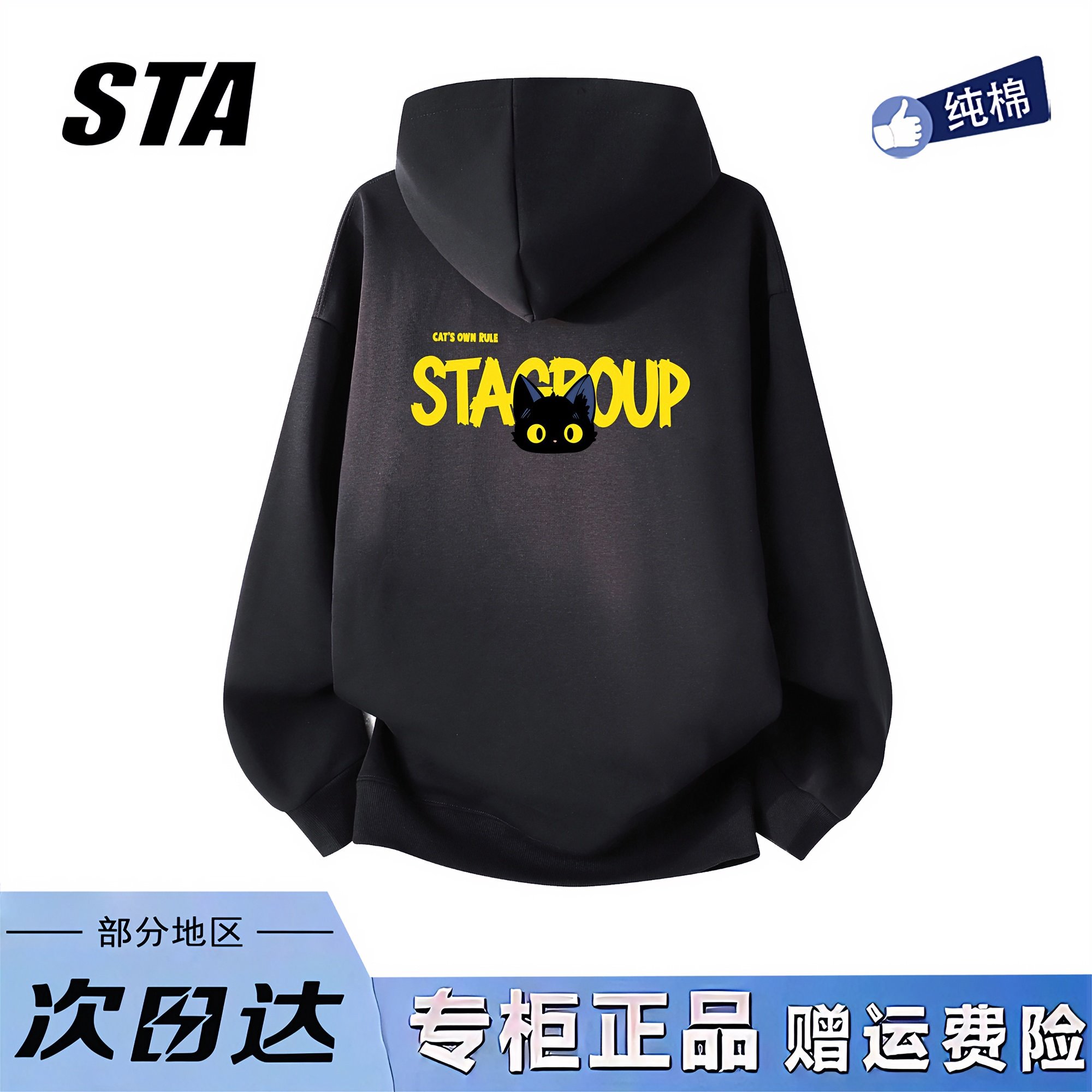 STA旗舰店美式潮牌趣味猫咪印花连帽卫衣男女秋冬季灰色加绒外套