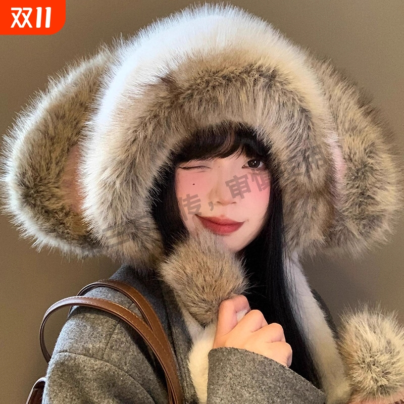围巾帽子手套一体女连帽冬季帽可爱保暖围脖毛绒冬天三件套厚防寒