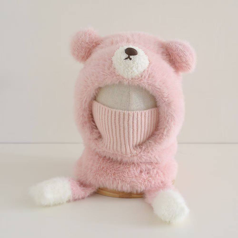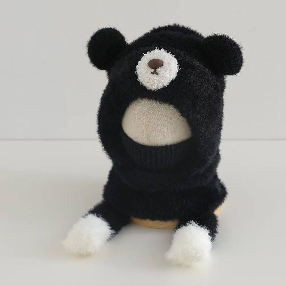 儿童帽子秋冬款可爱小熊男童围脖口罩毛绒保暖女宝护耳帽白色黑色