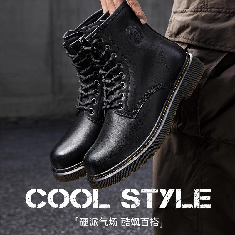 骆驼男鞋2025秋冬新款牛皮英伦潮流靴子增高厚底复古黑色马丁靴男