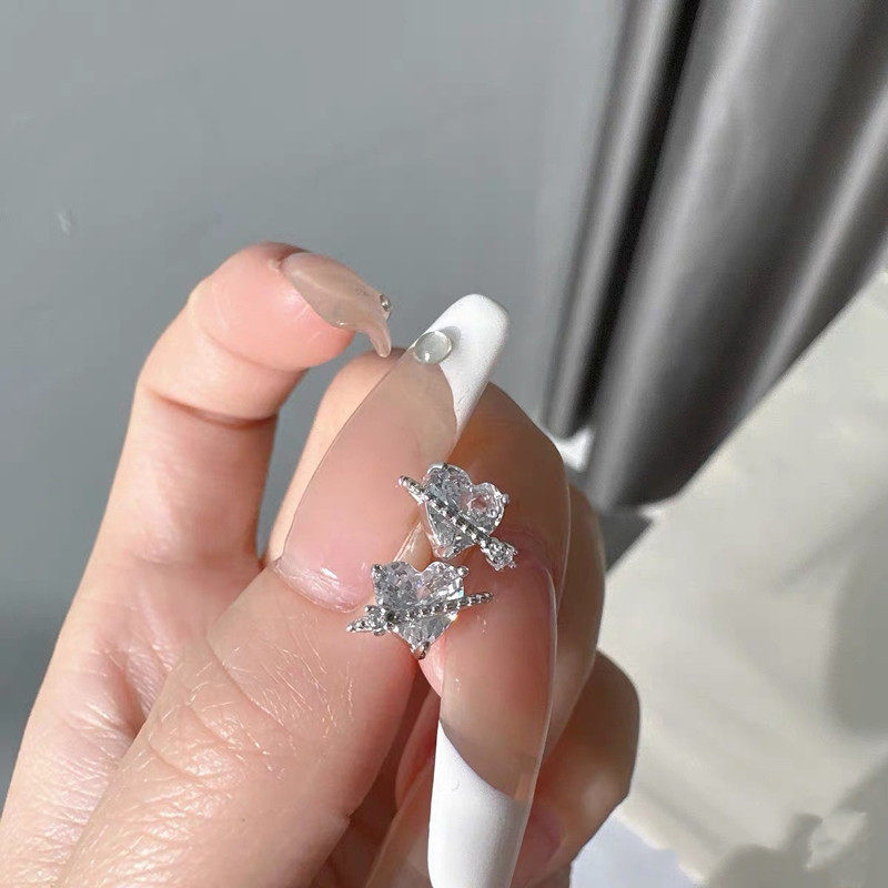 贝希银饰s925粉色锆石爱心耳钉女气质小众设计感韩国闪钻心形耳饰