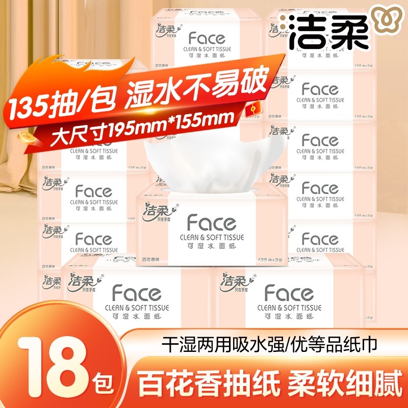 洁柔抽纸百花香3层135抽*18包整箱纸面巾纸可湿水面巾纸母婴适用