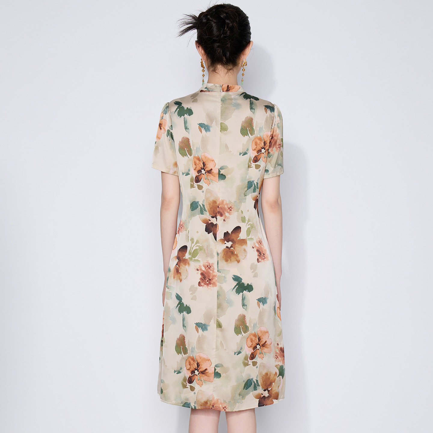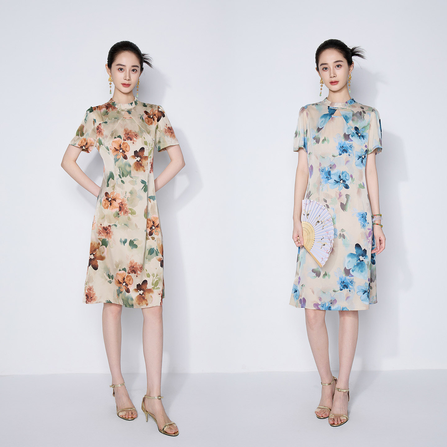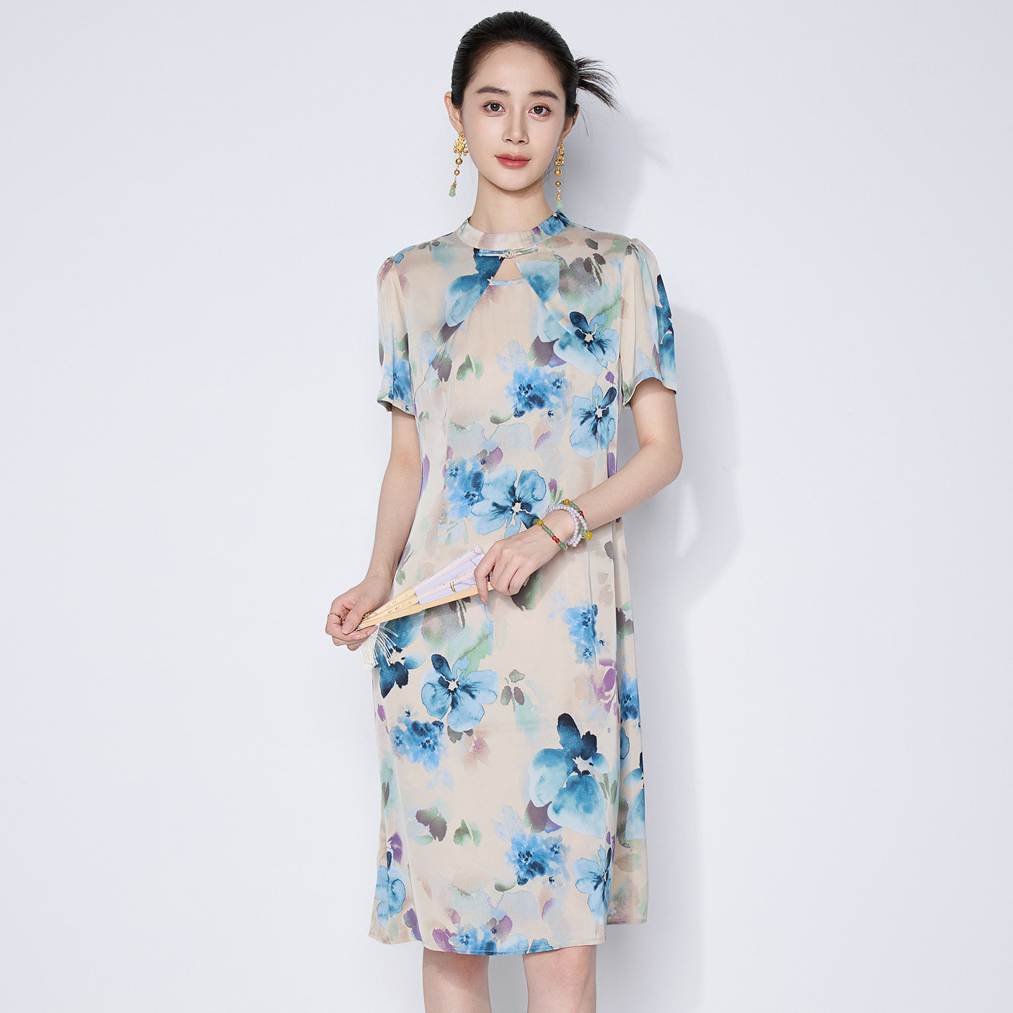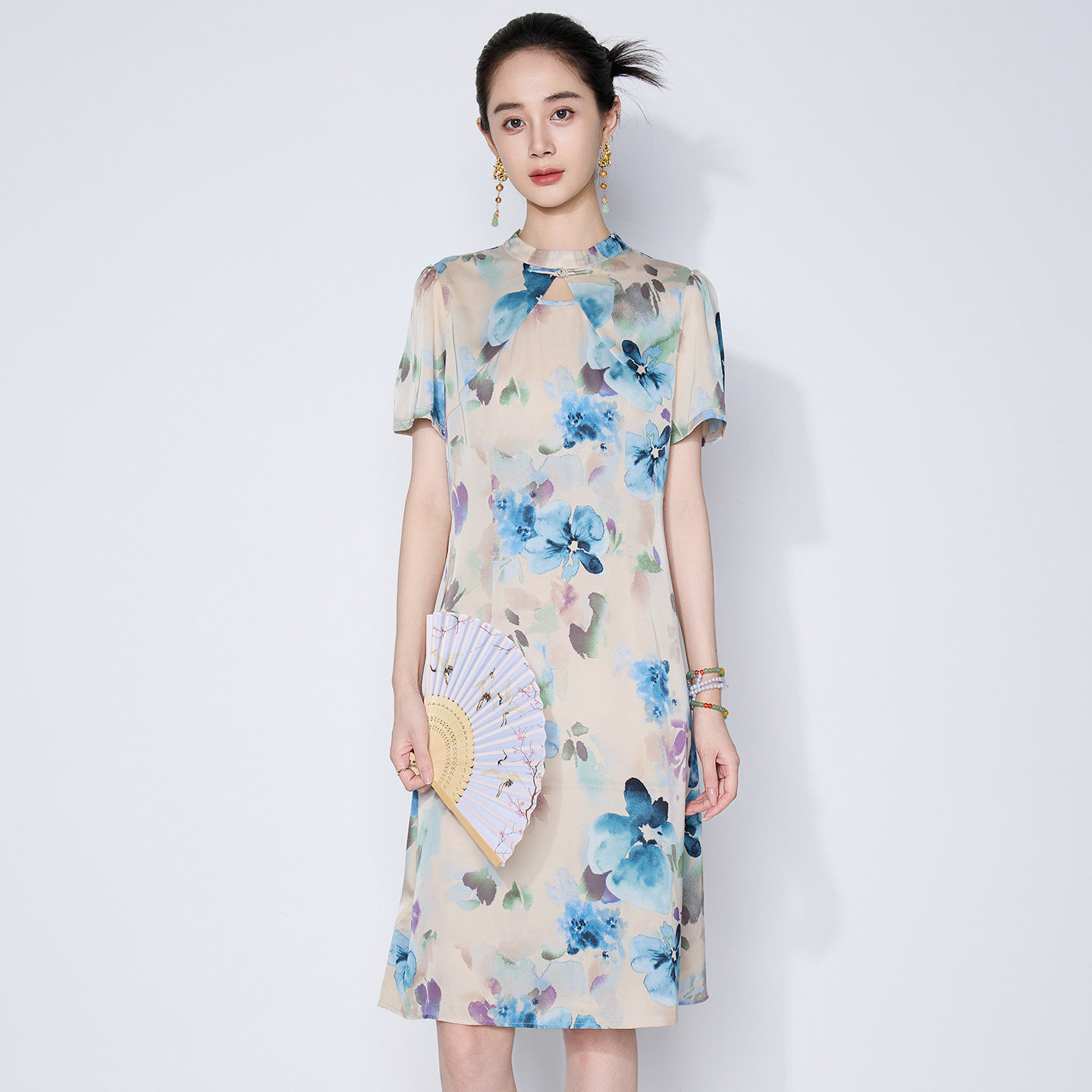 马天奴2025夏季新款印花立领连衣裙子新中式旗袍裙修身气质国风女