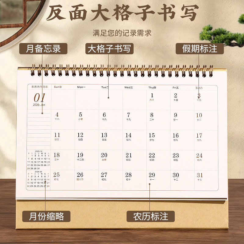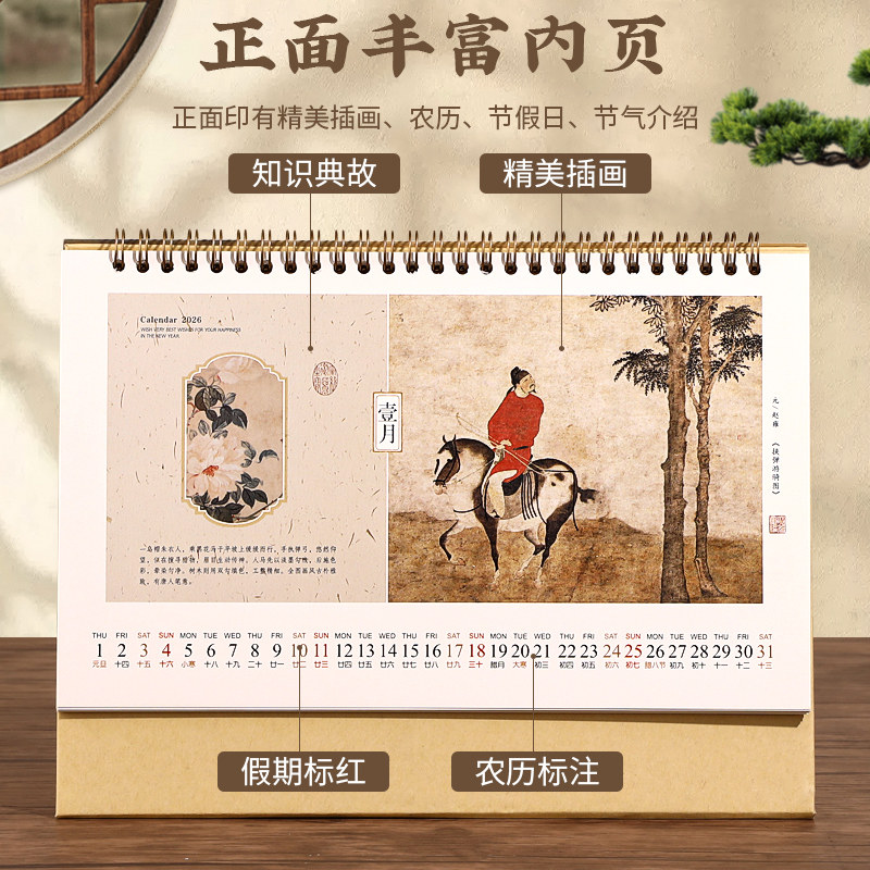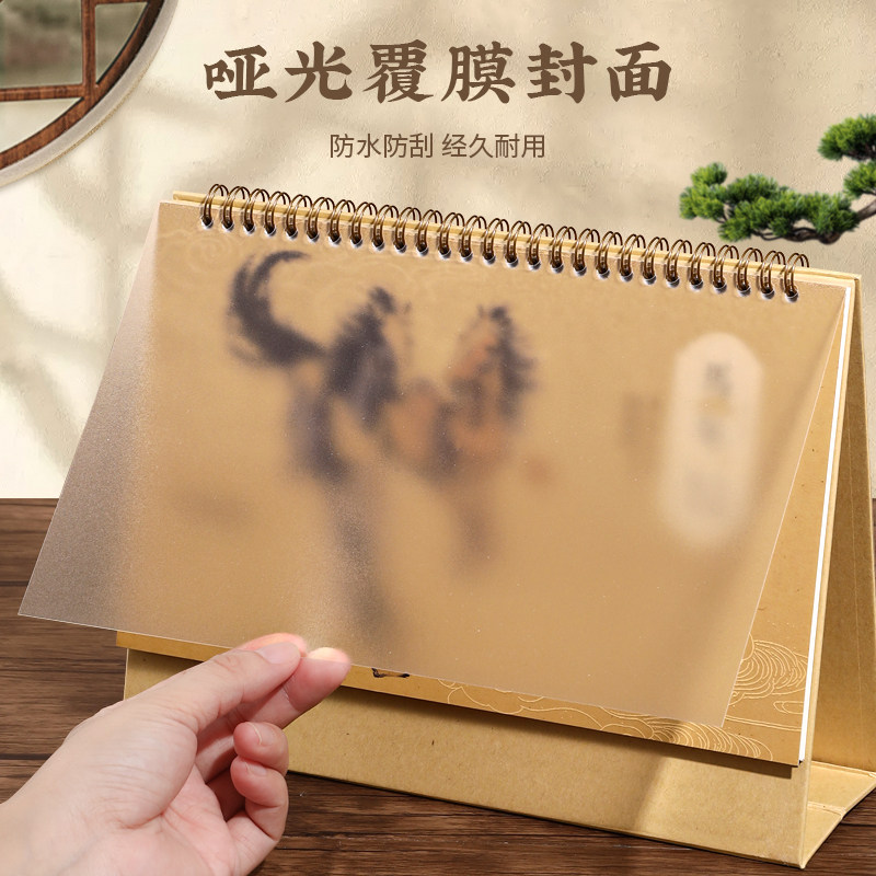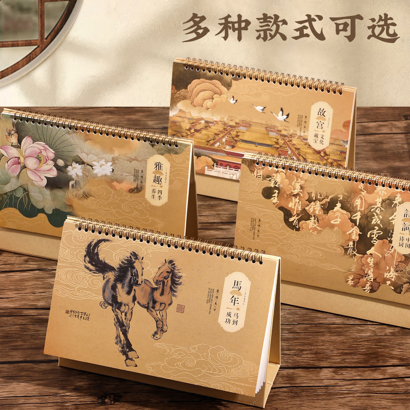 2026年新款艺术台历中国风复古简约线圈马年日历办公桌面创意摆件工作记事月历企业公司广告印刷品牌LOGO定制
