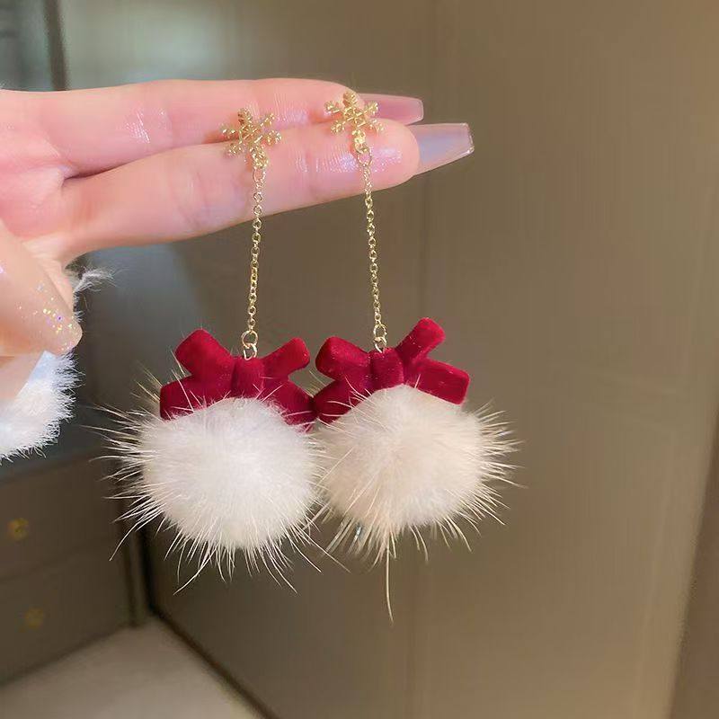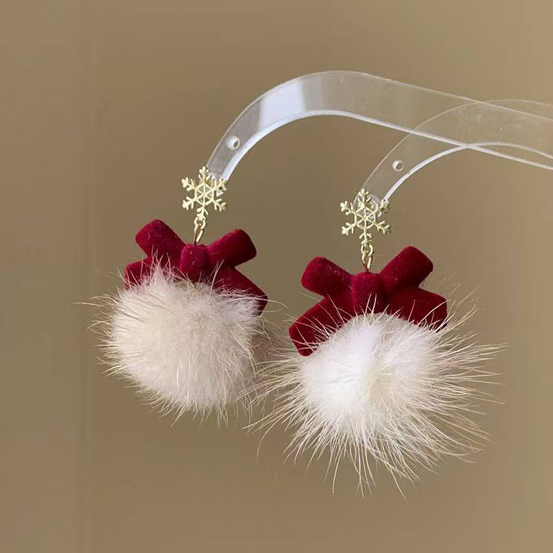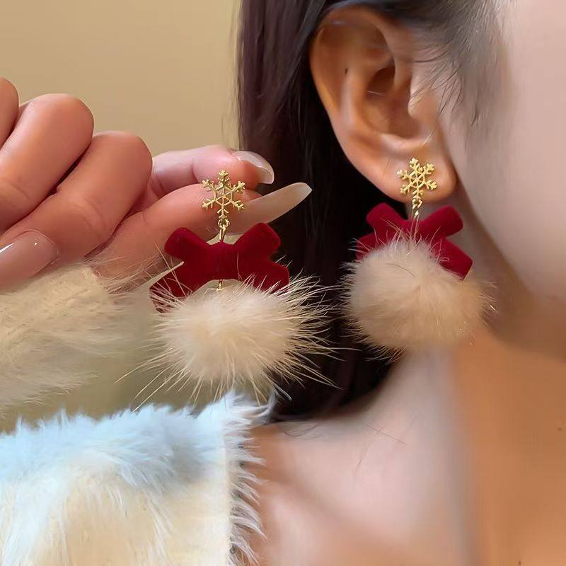 秋冬新款雪花红色蝴蝶结毛球耳环独特小众创意百搭气质耳饰