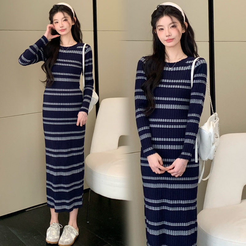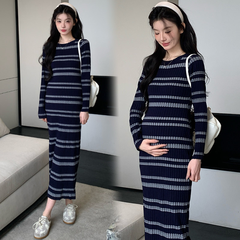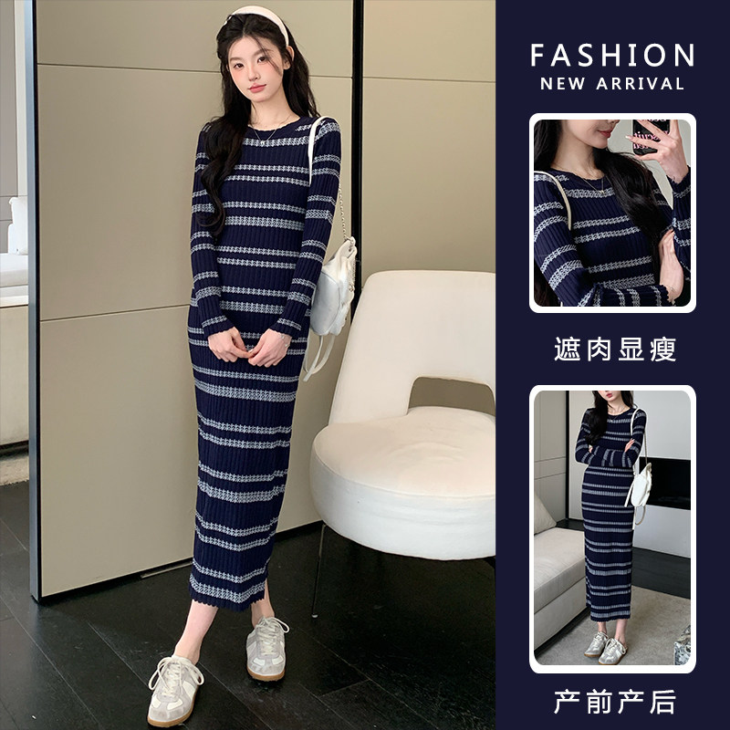 孕妇装秋冬连衣裙圆领撞色条纹针织连衣裙孕妈修身显瘦高级感穿搭