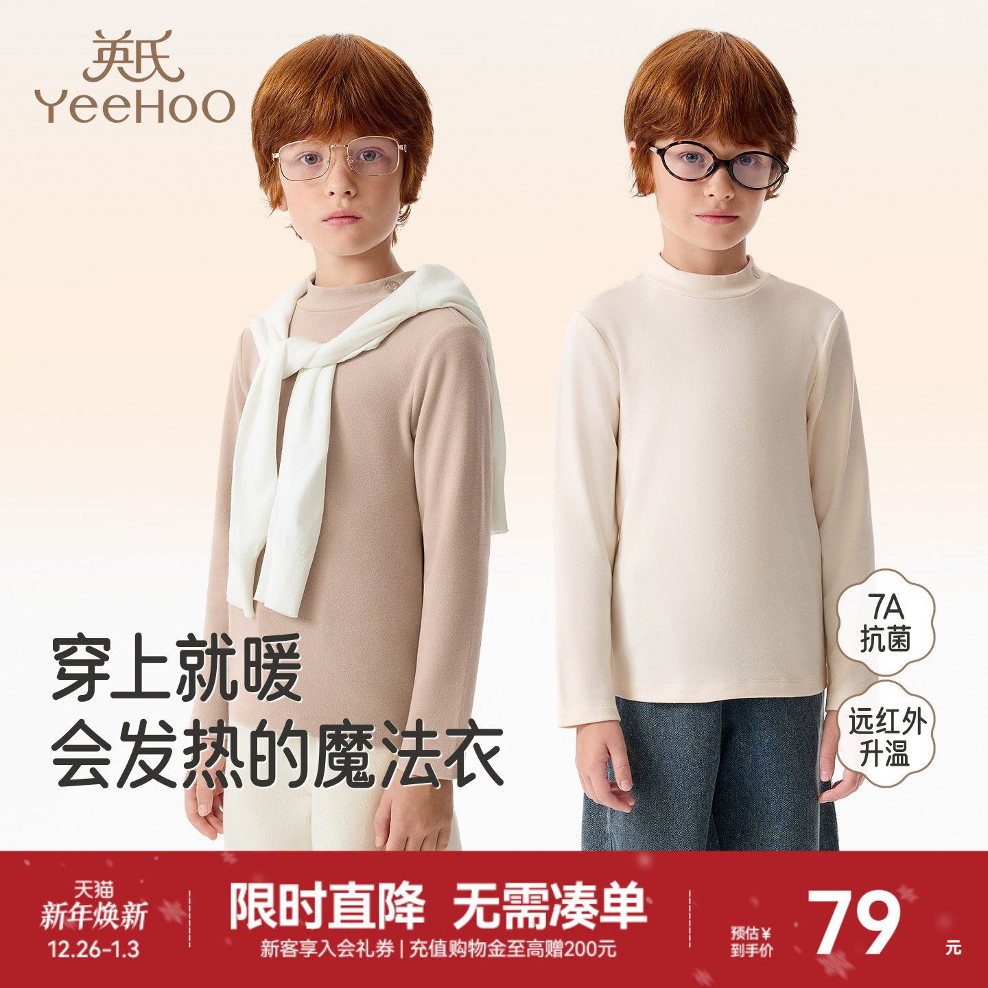 [发热绒]英氏儿童半高领打底衫秋冬t恤长袖男童女童秋衣春秋新款