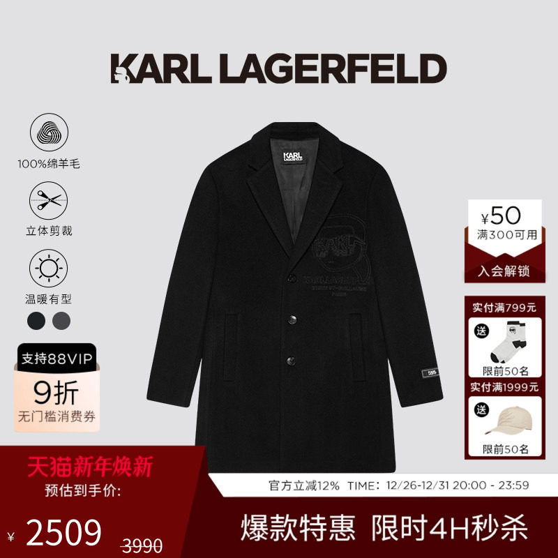 KARL LAGERFELD【100%绵羊毛】定制纽扣中长款毛呢大衣老佛爷男