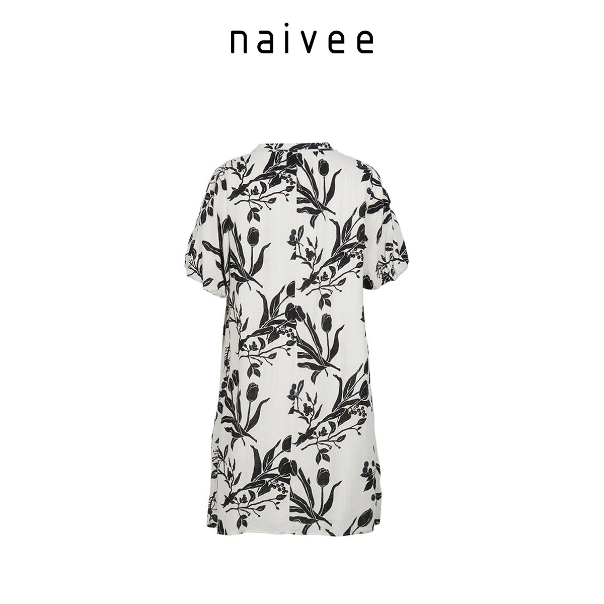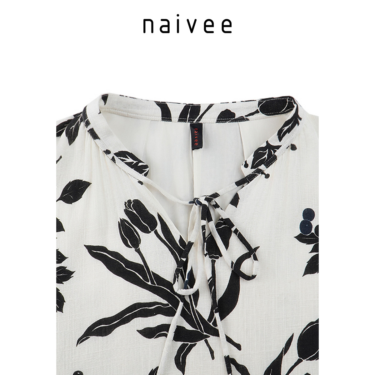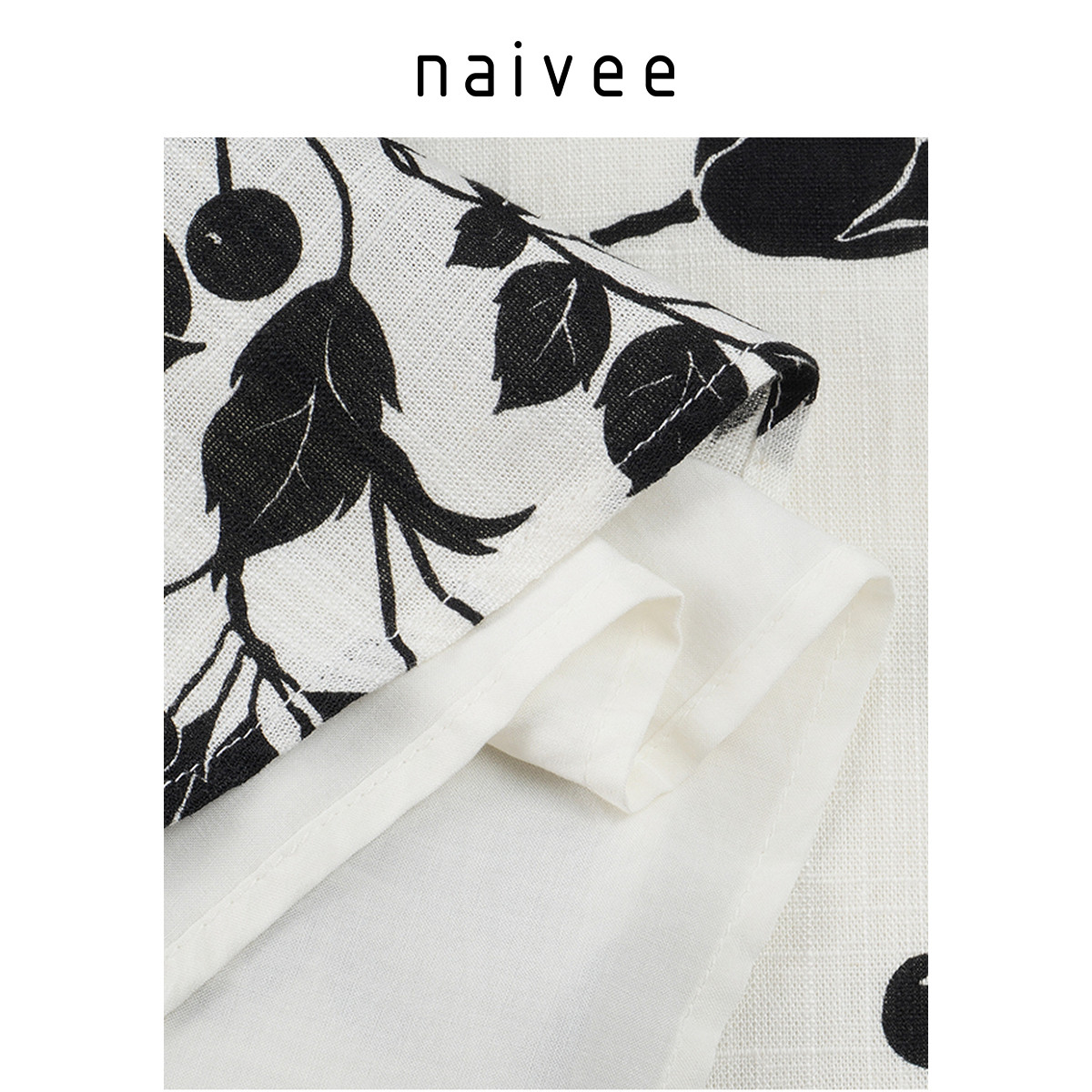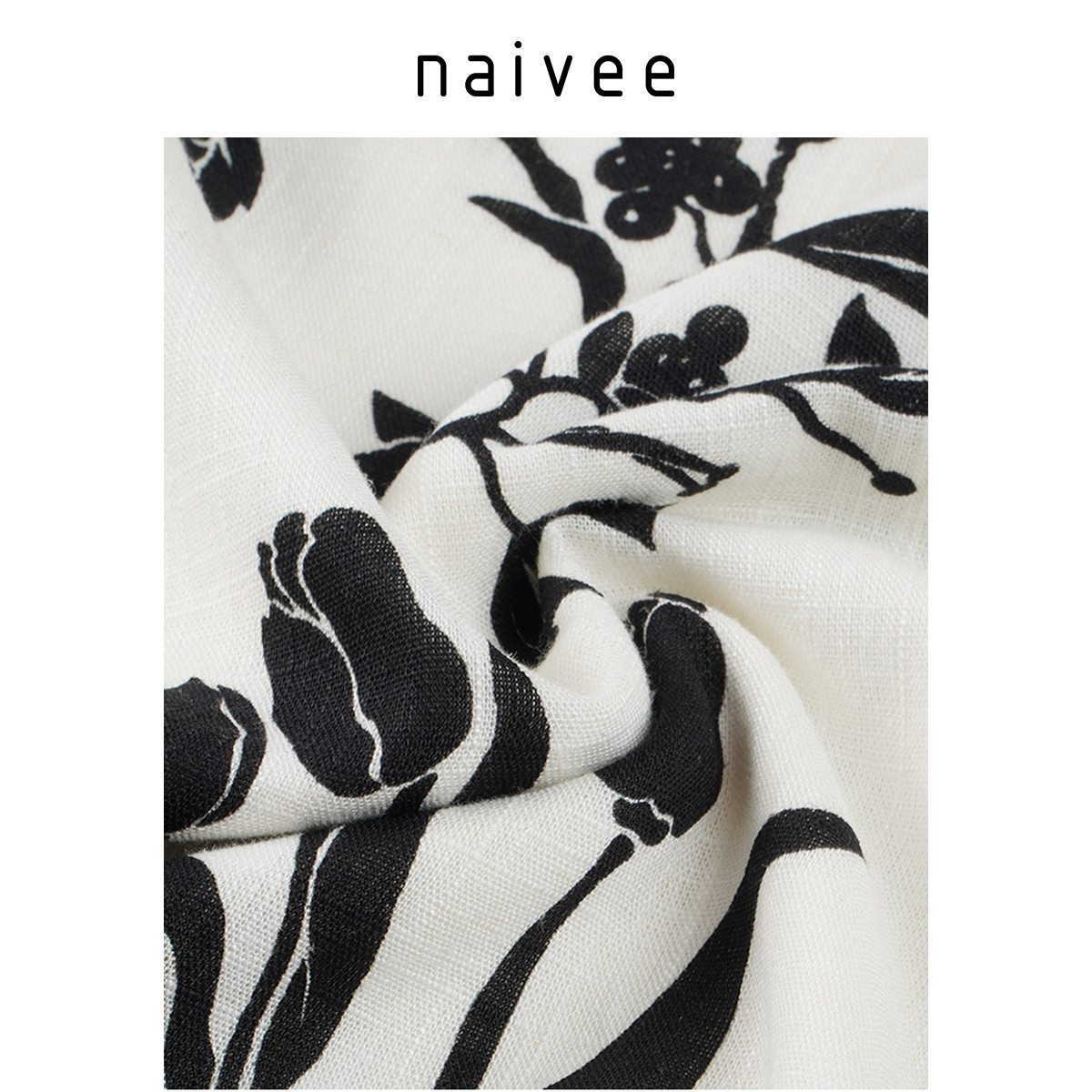 naivee秋款亚麻混纺墨色印花连衣裙V领系带度假风