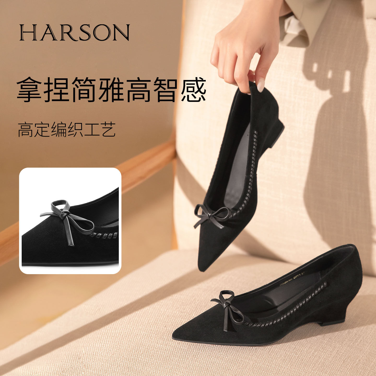 哈森尖头蝴蝶结浅口单鞋坡跟一脚蹬高跟鞋女2026春新款HWS260108
