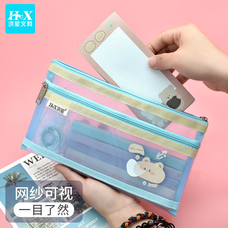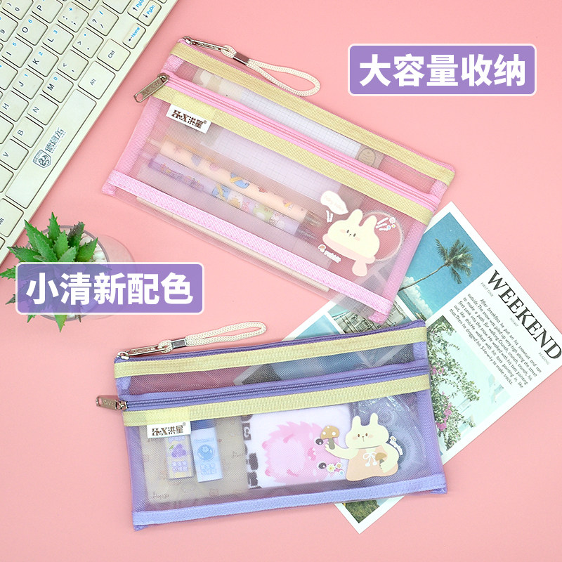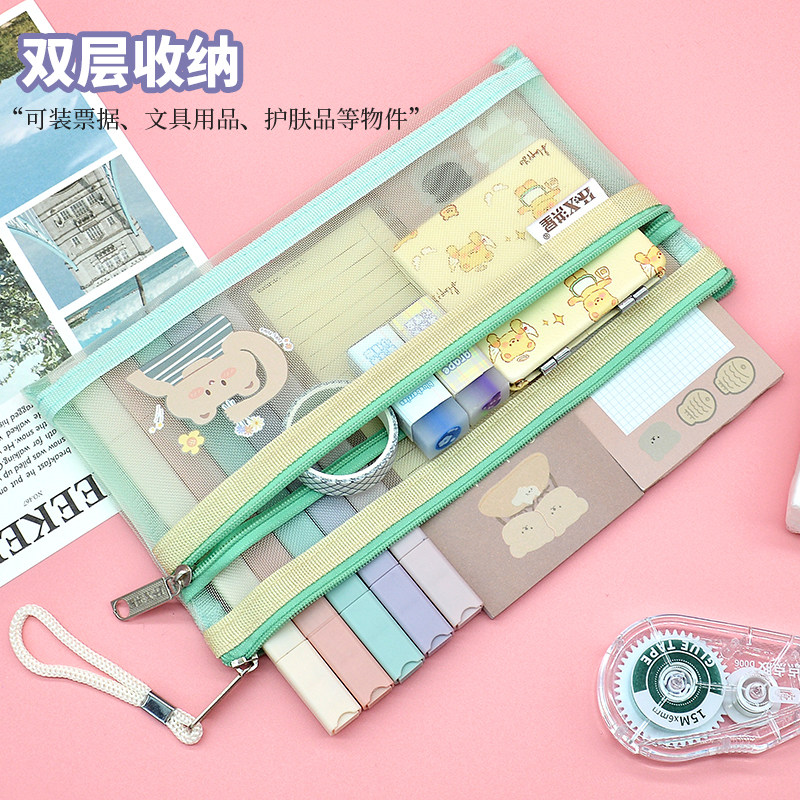 卡通双层网纱笔袋小学生一年级铅笔袋B6百元钞票袋高颜值可爱尼龙票据袋现金存放透明零钱袋充电器耳机拉链袋