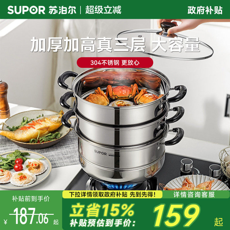 苏泊尔蒸锅家用304不锈钢蒸笼三层电磁炉煤气灶通用蒸煮一体汤锅