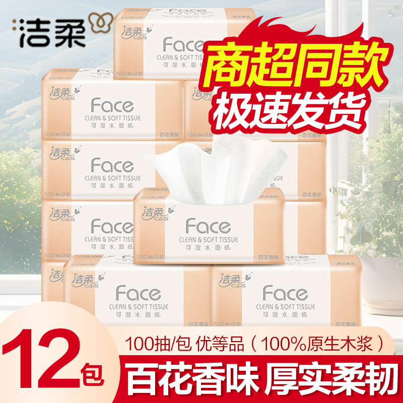 洁柔百花香face粉软抽纸三层100抽4提24包可湿水家用面巾纸擦手纸