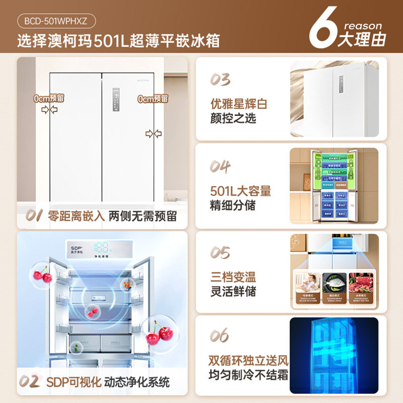 深594超薄平嵌澳柯玛501L零嵌家用电冰箱十字四门官方