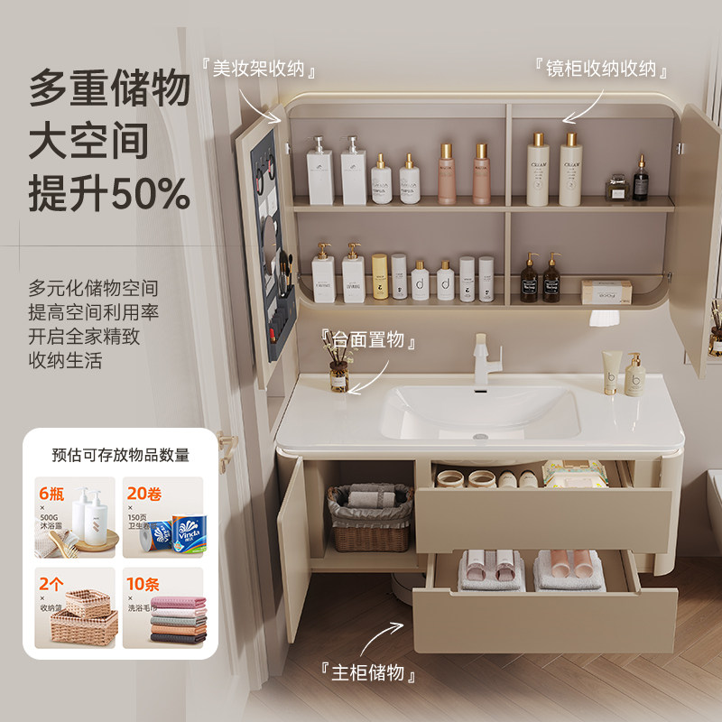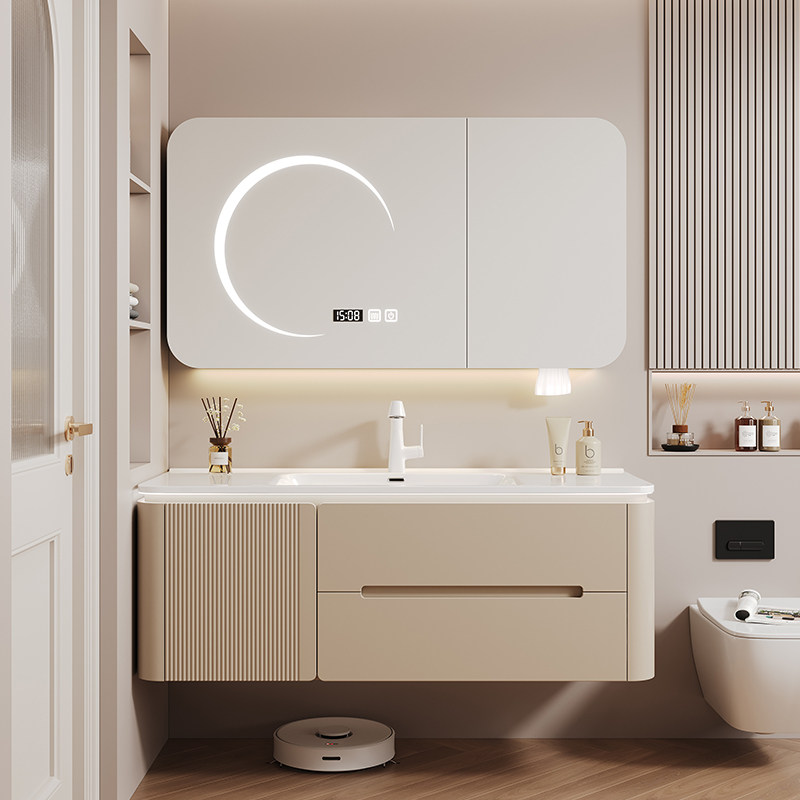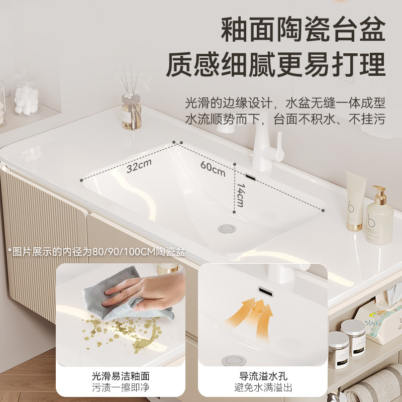 奶油风浴室柜圆角陶瓷一体盆卫生间洗手盆洗脸盆柜组合台盆卫浴柜