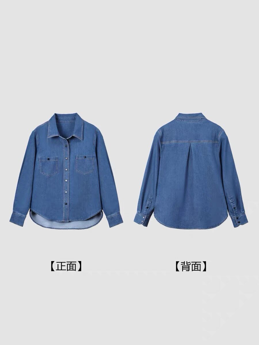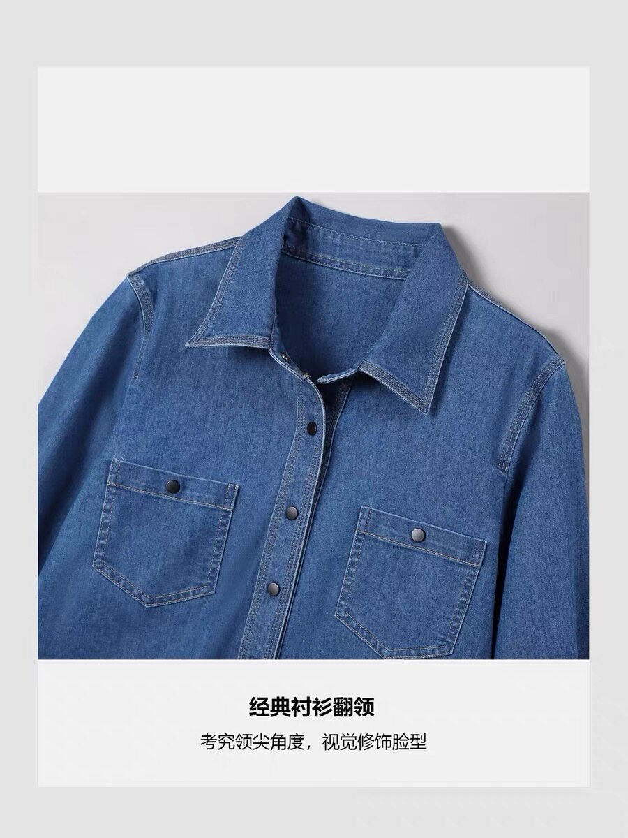 【休闲格调】官方经典款秋冬翻领长袖蓝色叠穿牛仔衬衫女衬衣显瘦