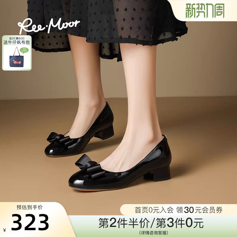 REEMOOR睿慕2026春季新款圆头蝴蝶结浅口坡跟瓢鞋女士中跟单鞋女