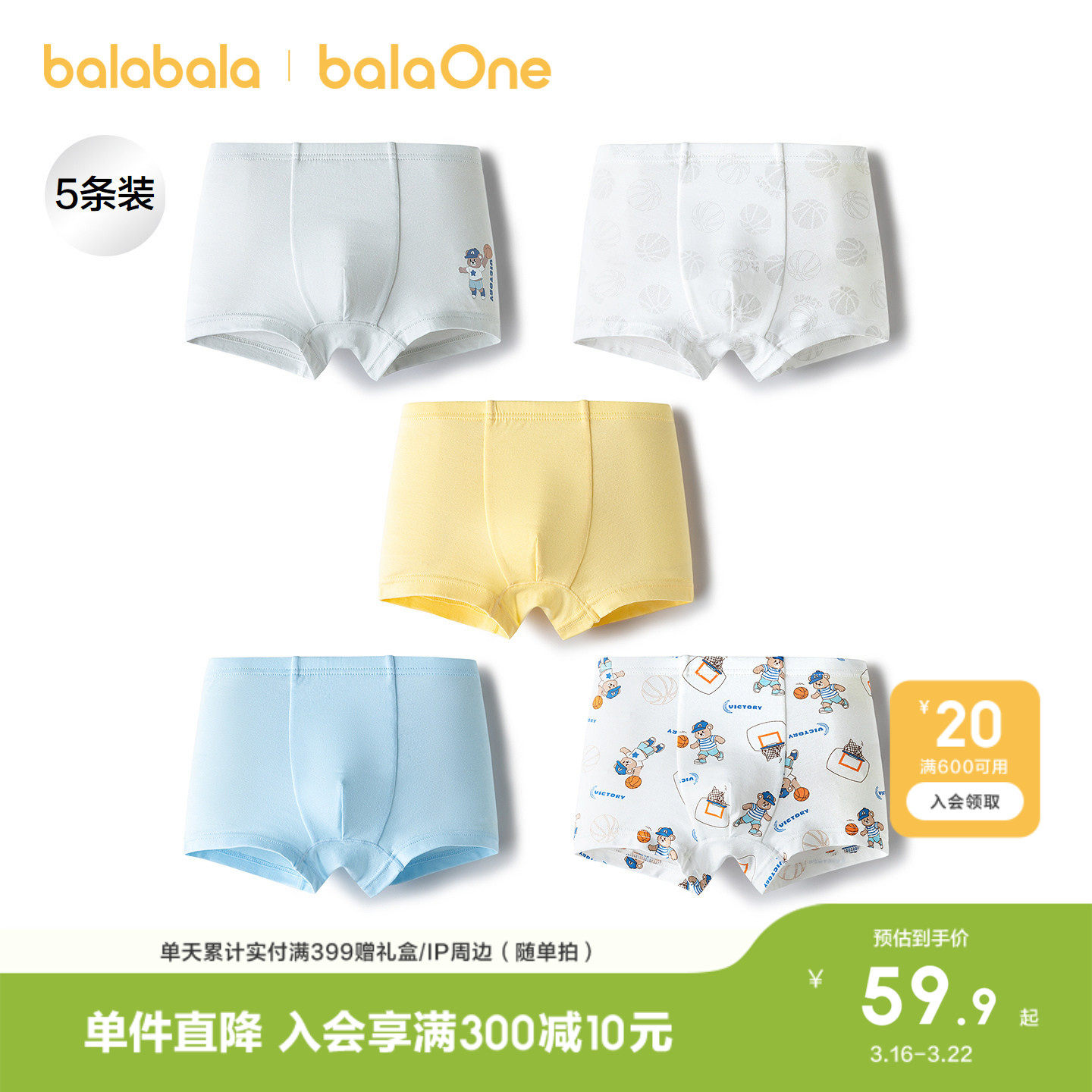 【balaOne】巴拉巴拉儿童内裤棉a类男童平角短裤柔弹四角裤五条装
