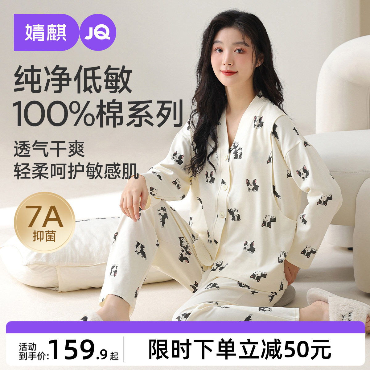 婧麒月子服十月份纯棉全棉吸汗产后孕妇睡衣哺乳喂奶待产家居服女