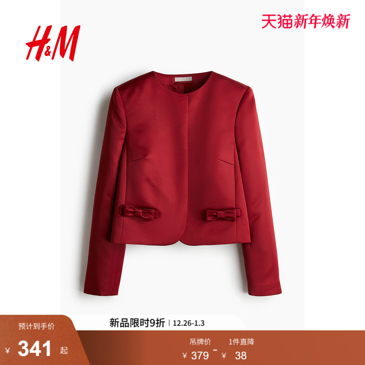 HM女装红色西装冬季节蝴蝶结装饰缎质礼服外套1258261