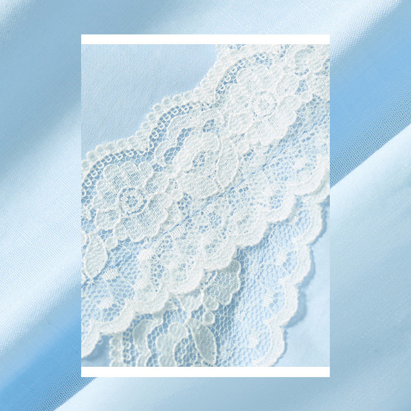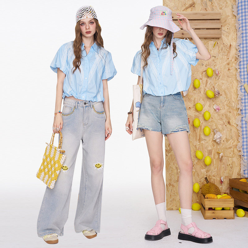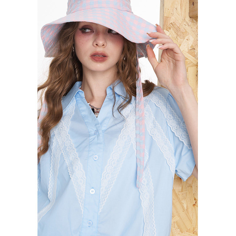 妖精的口袋蕾丝拼接泡泡袖v领短袖衬衫女2025夏新款甜美通勤上衣
