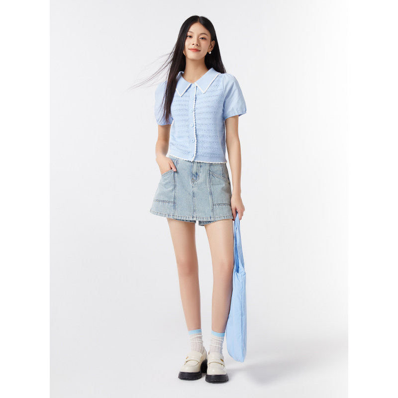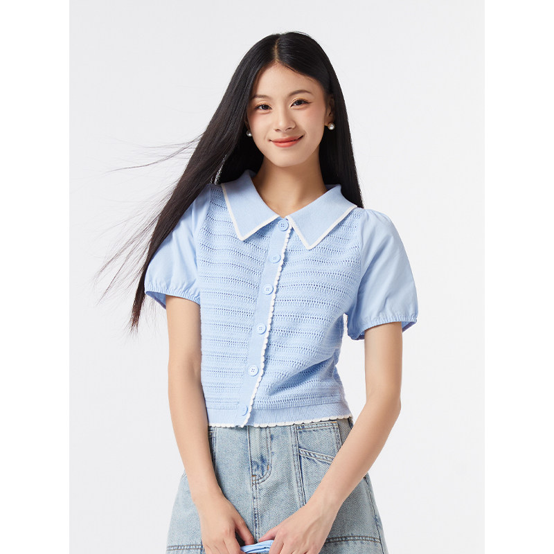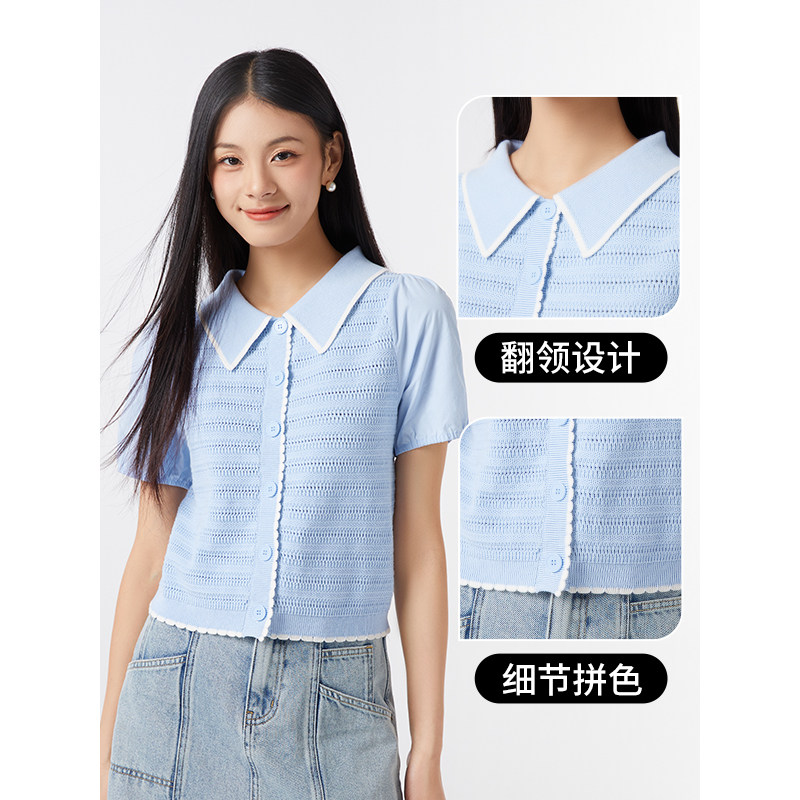 热风2024年秋季新款女士甜美拼接针织衫翻领泡泡袖淑女镂空上衣女