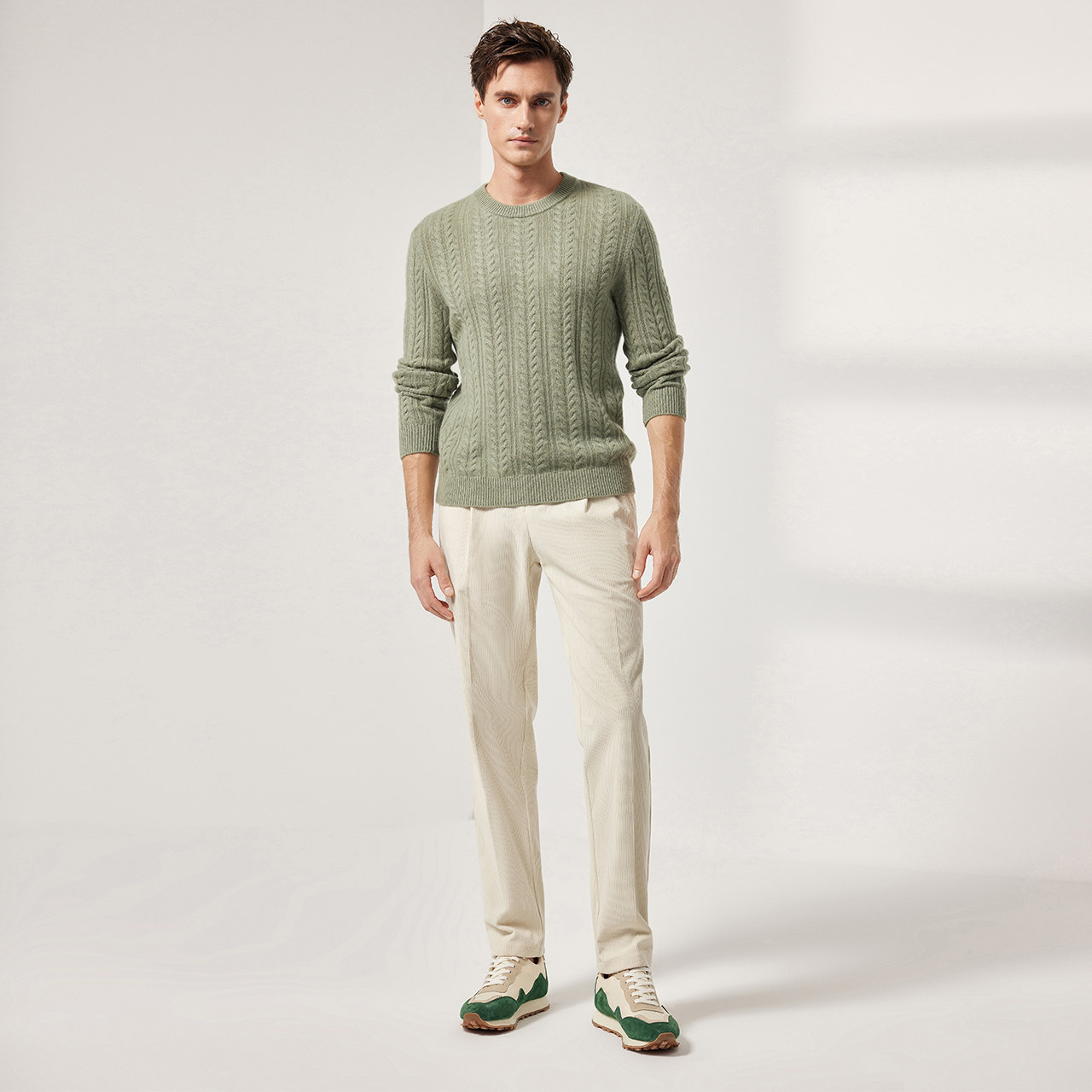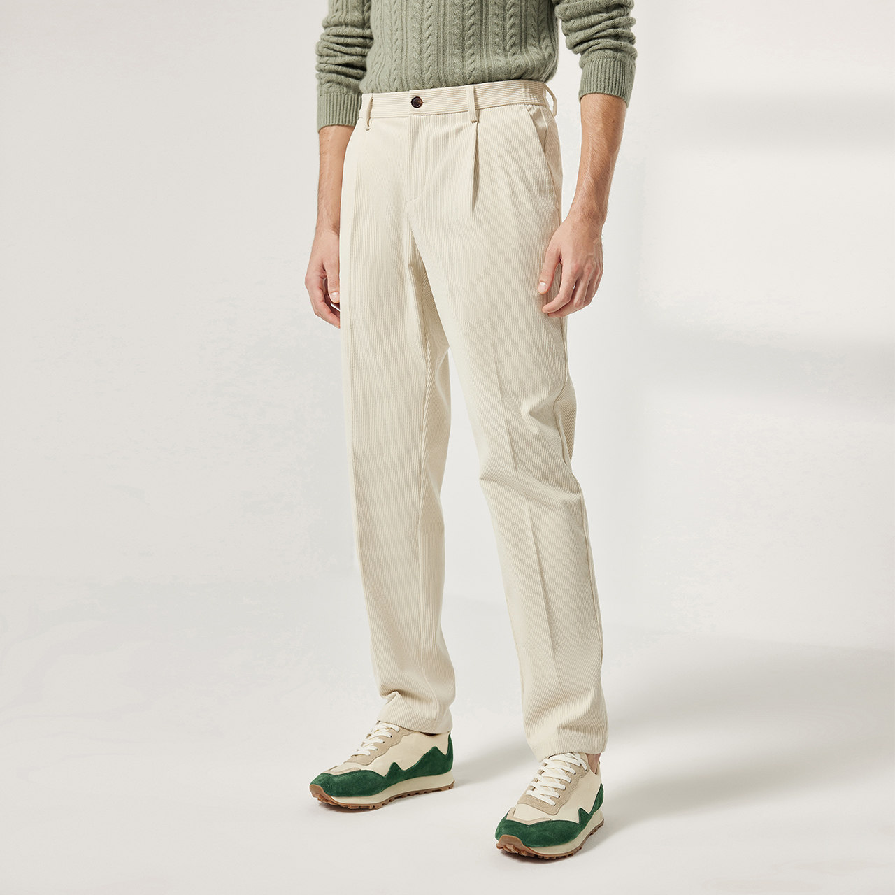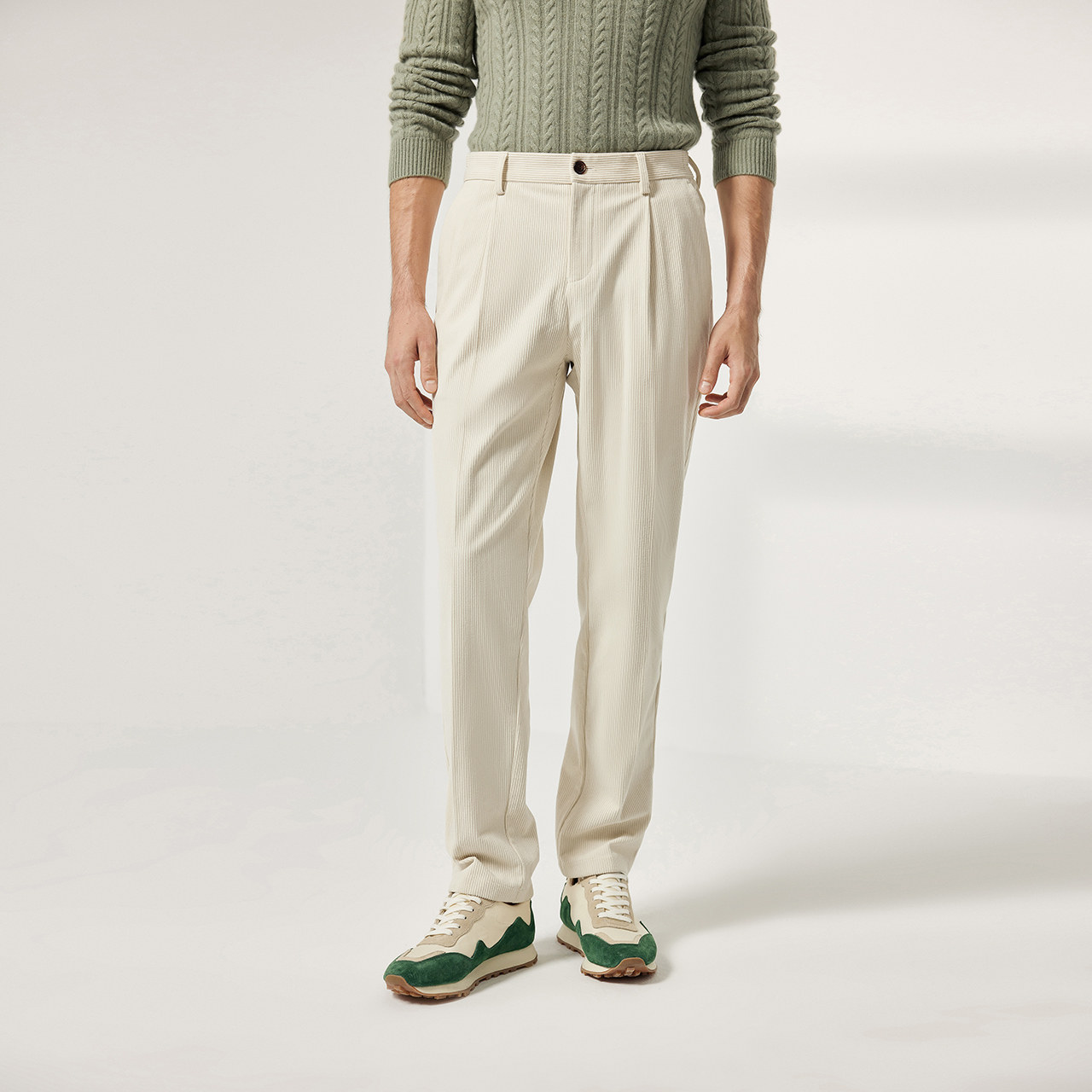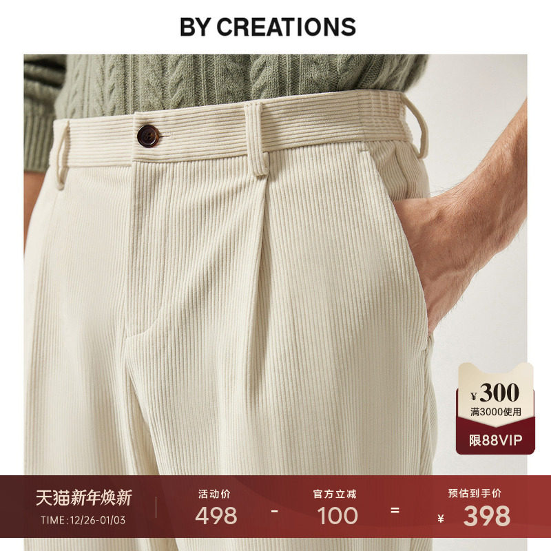 细坑条灯芯绒面料 微锥直筒版型 单褶设计