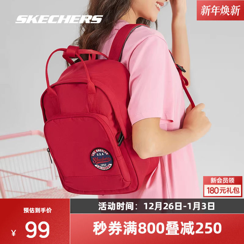 斯凯奇红色双肩包实用女款通勤包简约轻便背包男初中生书包大容量