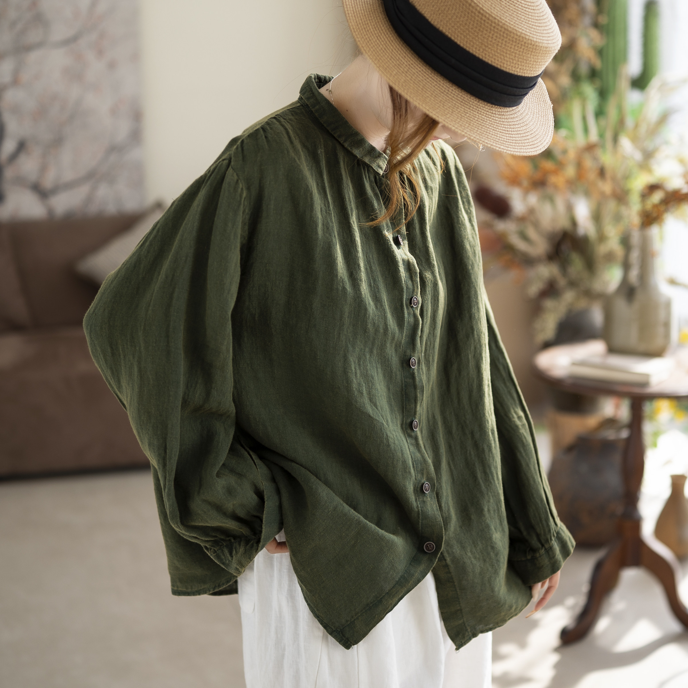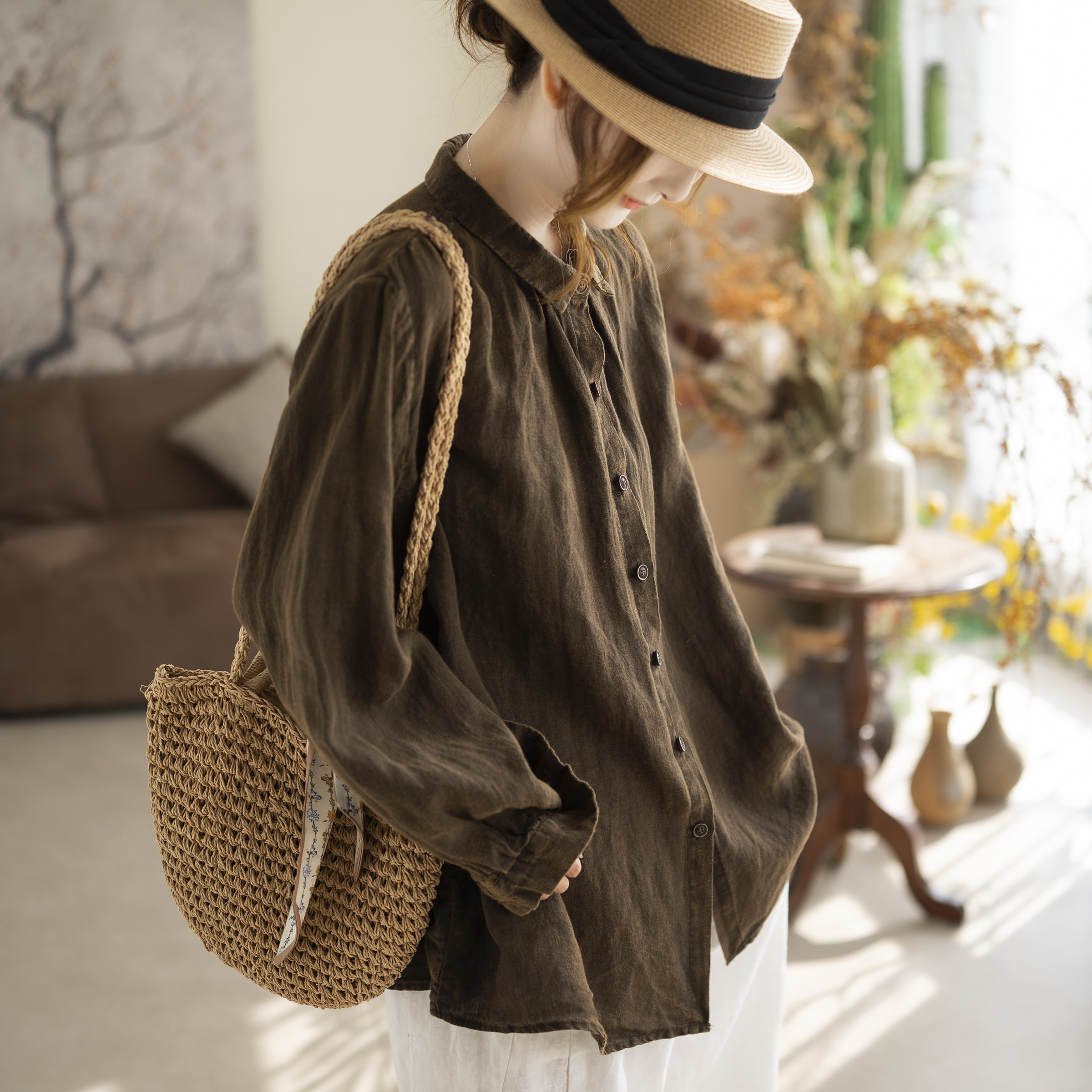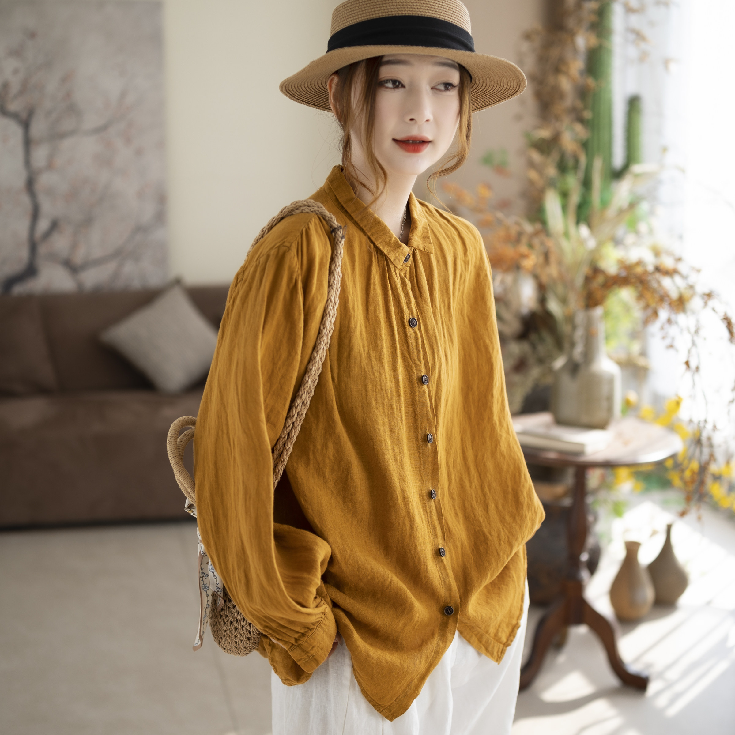 咖咪羽亚麻衬衣女宽松纯色休闲文艺显瘦流行气质女装上衣衬衫小衫
