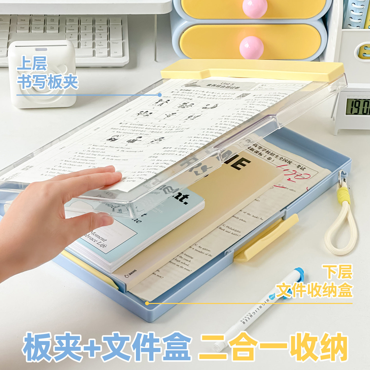 三年二班 A4板夹文件夹多功能文件盒手提款夹板多层收纳盒学生用写字垫板大容量试卷收纳册试卷夹办公资料册